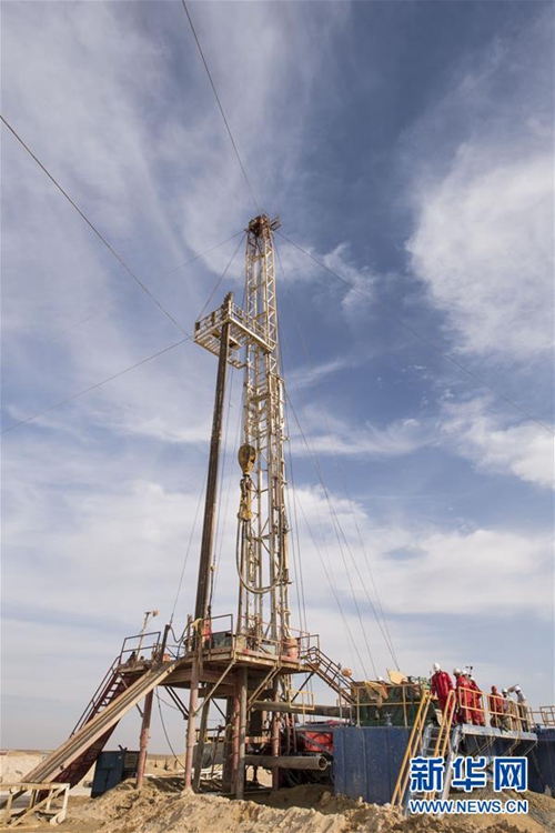这是11月20日在埃及明亚省的沙漠中拍摄的钻井现场。 2017年,中国中曼石油公司与阿联酋海湾集团签订合同,为该集团在埃及沙漠中的大型农业项目钻探300口水井。根据合同,中曼石油将先期完成30口井的试钻探,剩余水井将以每月7口的速度交付。目前有超过200名工人在钻井现场作业,大部分是埃及本地人。新华社记者李碧念摄