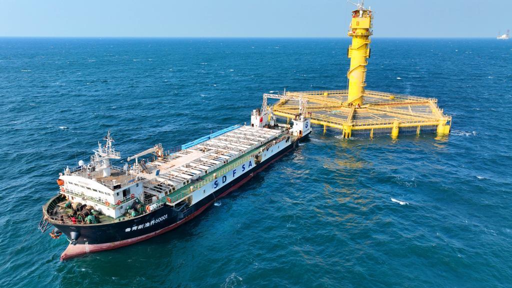 新华社青岛1月14日电 题:黄海深处渔汛来——冬日直击深远海三文鱼丰收 新华社记者王凯 从山东日照出发,经过14个多小时的海上颠簸后,1月12日5时40分许,记者终于抵达离岸130多海里的黄海中部青岛国家深远海绿色养殖试验区。漆黑的海面上有数点亮光,那是“深蓝2号”养殖网箱及其配套用于三文鱼初加工的工船。当天,工人们要开始收获三文鱼。 “三文鱼的养殖环境要求很高,找到一片适合的区域大规模养殖十分困难。但在我们脚下海域深处有一片13万平方公里的黄海冷水团,夏季水温在10至16摄氏度,非常适合三文鱼生长。”同行的山东财金万泽丰海洋科技有限公司生产负责人顾祺焕说,“深蓝2号”夏天下沉到30米以下冷水团位置,冬天再上升到水面,巧妙利用了这一大自然的“馈赠”,实现了我国在温暖海域养殖冷水鱼类的突破。 6时许,记者乘橡皮艇登上工船。这时潜水队长王立宾已经穿上潜水服、套上潜水帽、扣上潜水镜、挂上工具袋……他和队友要在收鱼前下水,把渔网在水下布置好,把鱼聚集在一定区域,方便后续工船用吸鱼泵吸鱼。收鱼过程中,他们还要按照指挥有序控制吸鱼管道进鱼口大小。 “只要天气和海况适合就要下水,平均每天都要在水下工作六七个小时。冬天水温有时只有五六摄氏度,在水里待一会嘴都僵硬了,咬不住呼吸器,脚蹼也打不动,一上来腿就抽筋。但我们的工作决定着整个收鱼是否顺利,因此再难也会克服。”王立宾说。 7时左右,记者跟随王立宾的潜水队一起坐上橡皮艇,从工船前往“深蓝2号”。 波涛汹涌的海面上,黄色的“深蓝2号”网箱巍然不动。这个高71.5米、直径70米、全潜状态设计养殖水体达9万立方米的“巨无霸”,是我国自主研制的大型全潜式深海智能渔业养殖装备。搭载自动投喂系统、水下成像系统等多种智慧化养殖设备,可实现深远海无人养殖功能。