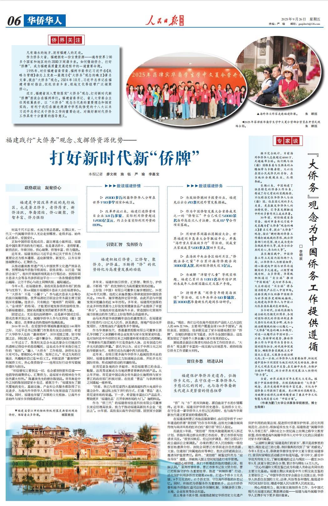9月26日,人民日报海外版华侨华人版整版报道点赞福建侨务工作!头条刊登《福建践行“大侨务”观念、发挥侨资源优势——打好新时代新“侨牌”》通讯,聚焦福建省深入贯彻落实“大侨务”观念、打好新时代新“侨牌”座谈会精神,借助侨力、打好“侨牌”;“专家谈”栏目刊发《“大侨务”观念为中国侨务工作提供遵循》。