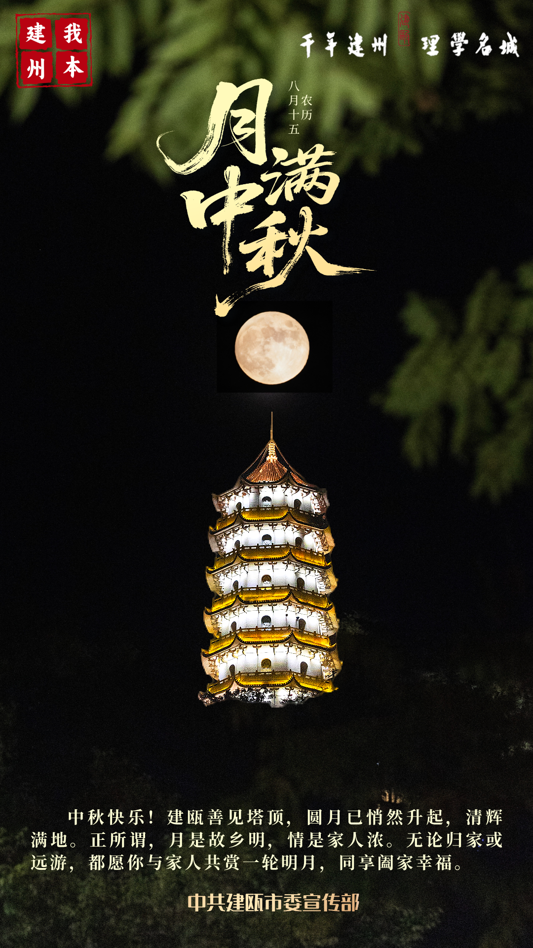 中秋快乐!建瓯善见塔顶,圆月已悄然升起,清辉满地。正所谓,月是故乡明,情是家人浓。无论归家或远游,都愿你与家人共赏一轮明月,同享阖家幸福。 |