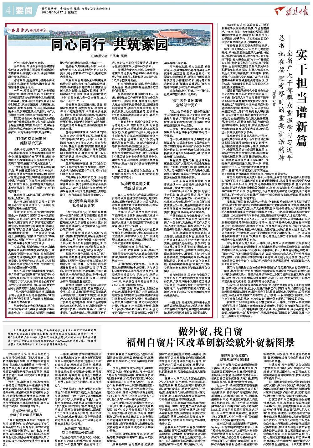2025年10月17日《福建日报》第04版 两岸一家亲,闽台亲上亲。 去年10月,习近平总书记在福建考察时强调,要继续在探索海峡两岸融合发展新路上迈出更大步伐。建设好两岸融合发展示范区。 谆谆嘱托,殷殷期盼,在闽山闽水之间回响。闽台相向而行、携手并进,激荡出澎湃的融合活力。 一年来,福建沿着习近平总书记指引的方向,围绕《中共中央、国务院关于支持福建探索海峡两岸融合发展新路建设两岸融合发展示范区的意见》(以下简称《意见》),突出以通促融、以惠促融、以情促融,积极探新路、作示范,推动两岸融合发展示范区建设走深走实,与广大台胞台企共享中国式现代化发展机遇。 《意见》出台以来,全省先后发布促进闽台融合政策措施4批62条,组织实施闽台融合发展重点项目200多个,两岸融合发展示范区示范效应逐步显现、影响日益扩大,示范区建设取得阶段性进展。 打造两岸共同市场 经济融合更实 金秋十月,海风习习。在厦门自贸片区海沧港综合保税区跨境电商监管中心,随着清脆的“嘀”声响起,来自台湾地区的跨境电商退货包裹顺利抵达,实现了“跨境直退”和“跨关区退货”。 “过去台胞台企在大陆购买的跨境产品,只能退货至台湾当地电商仓库,无法直接退至大陆电商卖家。厦门自贸片区推出新模式后,两岸经贸往来更加顺畅。”台商厦门佰增科技有限公司负责人林圣杰表示,台湾同胞与大陆民众享受同等服务,凸显了“两岸一家亲”的现实意义。 融合发展,基础在“通”。经贸合作畅通,是重中之重。 这一年,厦门自贸片区推出的“跨境直退”和“跨关区退货”,正是闽台经贸深度融合的生动写照。 厦门自贸片区 林梓健 摄 围绕“因台而设、因台而特”的发展理念,一年来厦门自贸片区充分发挥自贸试验区的示范引领作用,在探索两岸融合发展方面形成了多项可复制推广的经验。如推出对台跨境电商“跨境直退”与“跨关区退货”业务,在大陆首个跨越海峡的险种——“两岸通保”的基础上,拓展推出“健易保”“居无忧”等保障产品,打造“两岸一窗”服务品牌等,助力两岸融合发展示范区建设。 应通尽通,能通先通。一年来,福建继续会同中央和国家机关有关部门,深入践行“两岸一家亲”理念,努力探索更多应通尽通的路径模式、惠台利民的政策举措、心灵契合的方式方法,扎实深入推进两岸经贸人文交流,加快建设台胞台企登陆的第一家园。 前不久,第七批“福建老字号”名单公布,“天福”“金门高粱酒”“翁财记”等6个台湾品牌上榜。这是台湾品牌首次加入“福建老字号”大家庭,预示着台企将享有与大陆企业同等待遇,可以参与国家重大战略实施及两岸产业链供应链合作。 “两岸融合发展好处多多,福建是台商台企投资兴业的最佳选择。”拿到老字号“金字招牌”,台商天福集团创办人李瑞河喜不自禁。 从台青创业到台企做大做强,从“小三通”到“新四通”,福建以通促融之路从未止步。如今,福建已成为两岸往来最便捷、经贸合作最紧密的第一家园—— 经贸合作更加畅通。今年1—8月,新设台企1653家,实际利用台资6.6亿美元,闽台贸易额607.5亿元,继续位居大陆前列。 农业利用台资的数量和规模继续保持大陆首位。去年12月,新批设南靖、同安、平潭综合实验区等8个国家级台湾农民创业园,加上原有的漳浦、漳平、仙游等6个台创园,福建台创园数量达14个,实现全省九市一区全覆盖,在大陆占比超三分之一。 行业标准更加互通共通。目前,福建在机械制造、现代服务业、农林渔业等31个领域开展了39项标准共通试点,累计公布共通标准308项。两岸在行业规则上更加互通,促进了产业发展、经贸合作,有助于共同开拓国际市场,已经成为两岸融合互通的桥梁纽带和技术支撑。 基础设施加速联通。“小三通”客运航次由2024年每周210航次增长至2025年每周252航次。今年1—9月,运送闽台旅客140万余人次,同比增长50.1%。厦金大桥厦门侧项目建设稳步推进,福(州)马(祖)通道大陆侧工程前期工作加快推进,厦金大桥(厦门段)、厦门新机场、福州机场二期等对台枢纽通道按序时推进。 能源资源循序互通。厦(门)金(门)通气工程大嶝LNG气源站竣工验收,具备投产条件;截至今年8月,累计向金门供水4350万吨。 “两岸融合发展不断加速,为台胞台商带来更多发展机遇。”全国台企联常务副会长、厦门台商协会荣誉会长吴家莹说,习近平总书记对福建建设好两岸融合发展示范区的殷殷期望,更加坚定了广大台商在闽创业发展的信心。 建设两岸共同家园 社会融合更宽 “打开闽政通App‘台胞台企数字第一家园’专区,就可以根据自己的需求,选择所需要的掌上服务了。”台青郑麒峻在入职位于三明的台湾乡建乡创团队跨界自造后,通过闽政通App顺利办理了医保、社保。 为了让数据“多跑路”、台胞“少跑腿”,福建以数字赋能两岸融合发展示范区建设。去年,“台胞台企数字第一家园”上线以来,至今已为台胞办理医社保、公积金、公租房申请等1.2万件服务事项,基本实现了“一网通查”和“全网通办”。 深化两岸融合发展,活力在“惠”,根本目的是要增进两岸同胞的亲情和福祉,实现两岸同胞对美好生活的共同向往。这一年,随着一系列惠台利民政策措施的出台,台胞在闽生活、学习、工作、创业更加便利、更有保障,示范区建设形成一