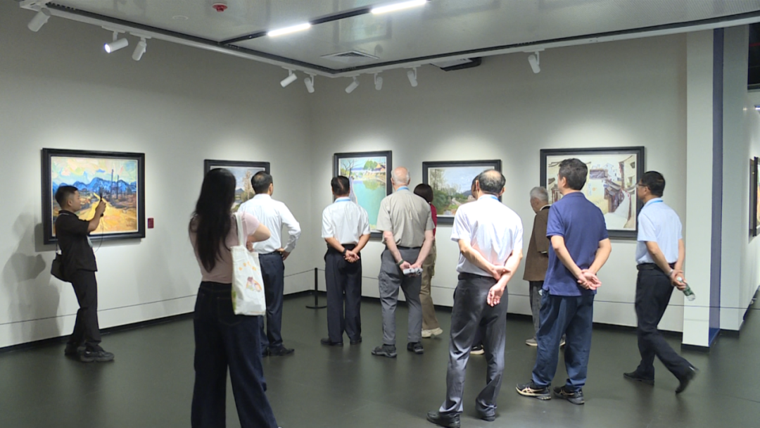 在建州美术馆,来自中外的专家学者们参观了王辉 殷雄 陈铎三人作品展、中国油画家建州写生作品精选展、陈德版画精品展,讲解员通过专业的美术角度,深度讲解了每一幅画的美术功底及背后的人文故事。吴伟还就画展所展现的城市风光、历史文化底蕴等与现场专家学者们互动交流。
