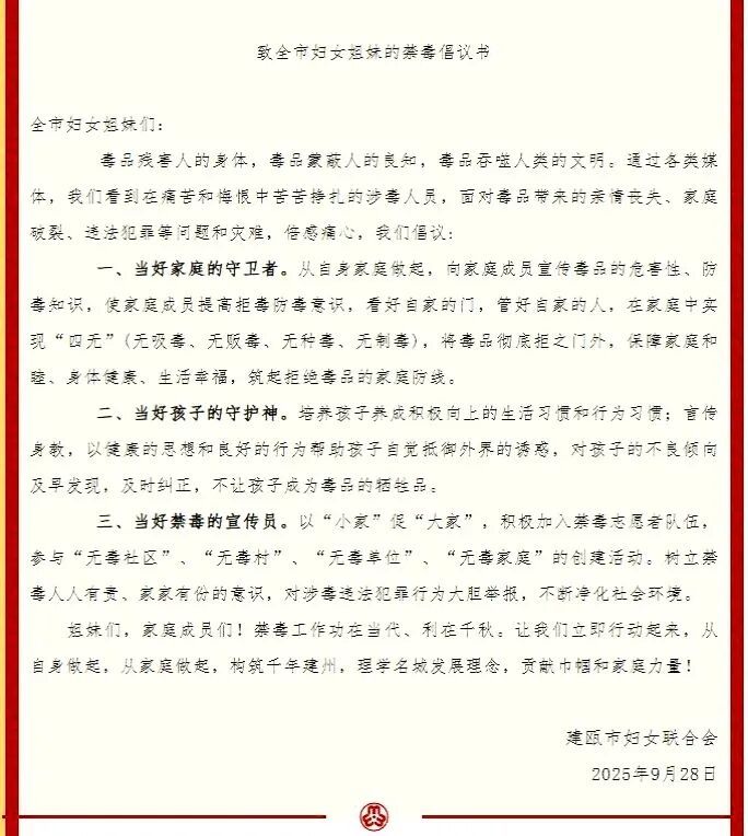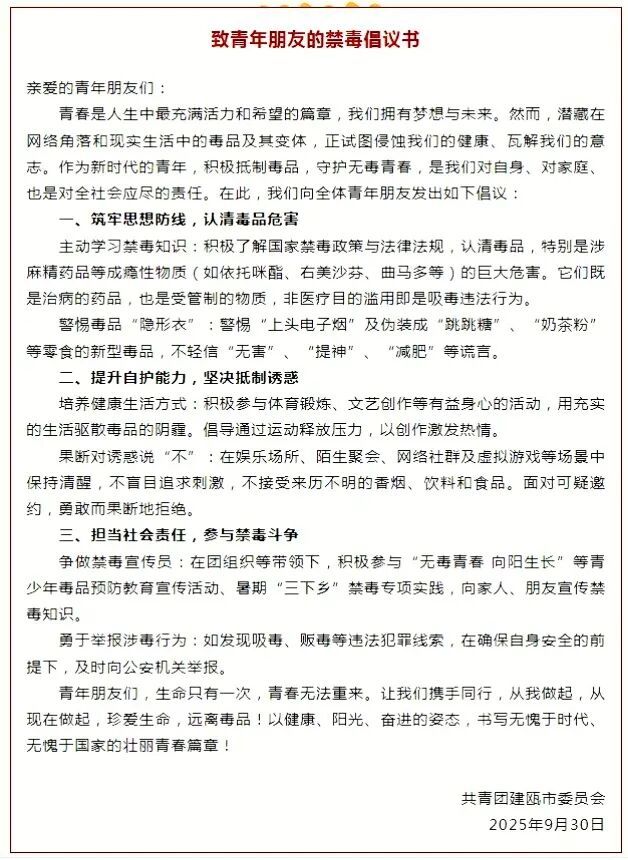 线下宣传有温度,线上传播有广度。我市同步发力线上宣传阵地,依托各类政务公众号搭建“线上禁毒宣传矩阵”,全方位扩大禁毒宣传覆盖面。市委文明办、团市委、市妇联分别通过官方公众号发布《致市民朋友的禁毒倡议书》《致青年朋友的禁毒倡议书》《致全市妇女姐妹的禁毒倡议书》,从不同群体视角发出禁毒号召,呼吁广大市民、青年、妇女积极参与禁毒工作,形成“人人关心禁毒、人人参与禁毒”的强大合力。