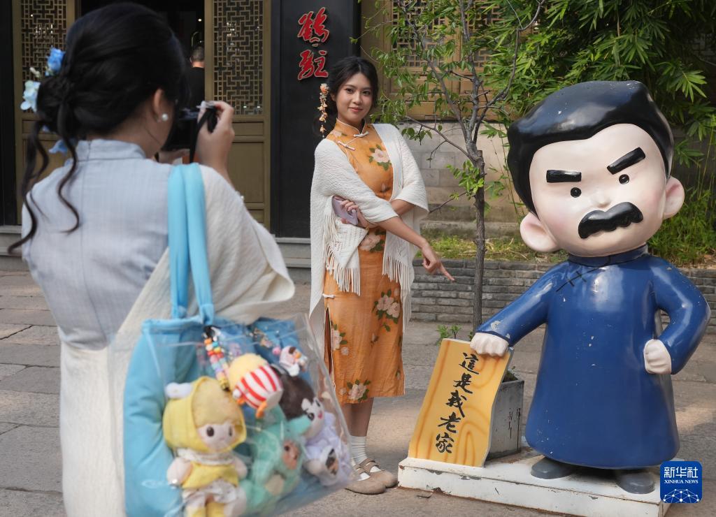 10月23日,游客在鲁迅故里和鲁迅的创意塑像合影。 近年来,位于浙江绍兴越城区的鲁迅故里围绕鲁迅及其文学世界,持续打造特色文化IP,有效延续了文化名人的当代活力。目前,鲁迅故里与8家设计团队达成合作,作为官方供应商共同开发以鲁迅及其文学作品为主题的文创纪念品与特色餐饮单品,并结合季节更迭设置主题打卡点,吸引大量游客前来游览。 新华社记者 翁忻旸 摄