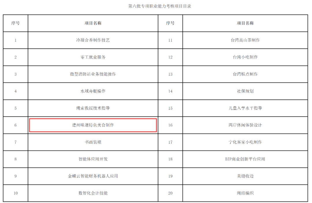 近日,福建省人力资源和社会保障厅办公室发布《关于公布第六批专项职业能力考核项目目录的通知》(闽人社办〔2025〕131 号),“建州味道特色美食制作”成功入选省级专项职业能力考核项目,标志着建瓯特色美食制作技艺正式纳入规范化技能人才培育体系。