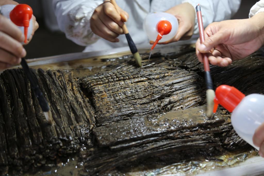 图为文保人员正在进行竹简保护工作。(江西省文物考古研究院供图) 南昌汉代海昏侯墓考古发掘成果公布十周年暨汉代区域文化学术研讨会11月7日至9日在南昌举办。方北松在8日的主旨发言中表示,大部分简牍的保护工作已完成,剩余部分预计在2026年完成。其中,包括514枚竹简的整理揭剥、清洗等保护工作,以及1840枚竹简的脱水、修复、封护等保护工作。