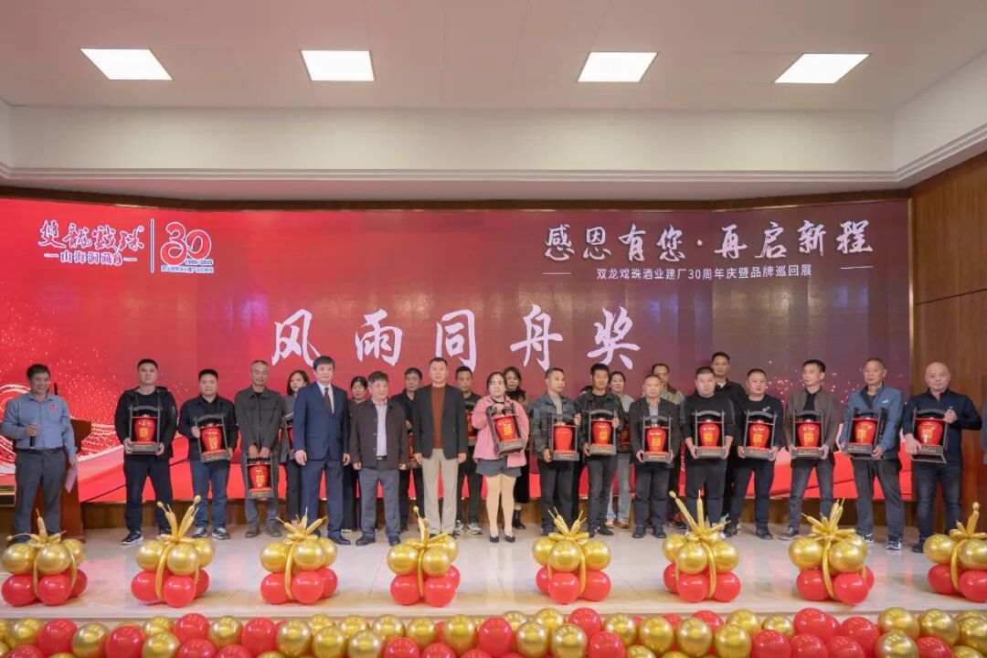 活动现场,企业回顾了三十年奋斗历程,发布了面向2025至2030年的新战略蓝图、厂区开放日及品质体验会活动方案、我与双龙戏珠的故事征集活动方案,解读了“双龙戏珠30周年厂庆品牌巡回活动方案”,举行了“风雨同舟奖”颁发仪式;并正式启动双龙戏珠酒业建厂30周年庆暨品牌巡回展活动。