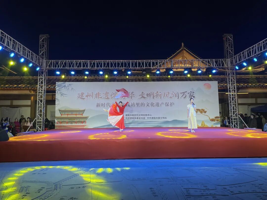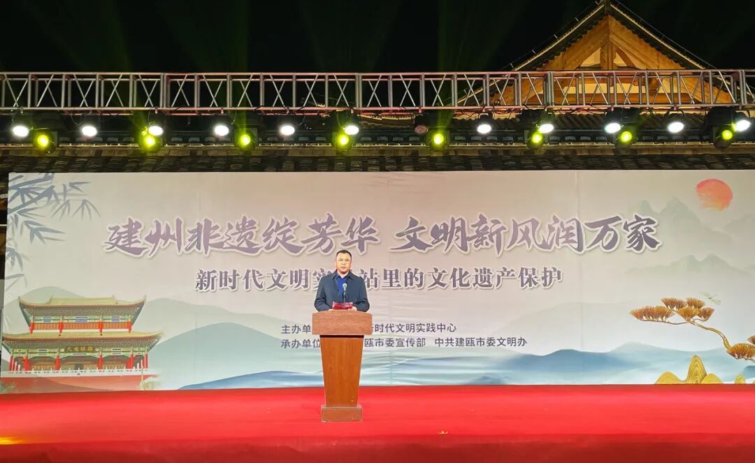 夜幕降临,建瓯市芝山公园露天影院广场文脉流淌、暖意融融。11月25日晚,“建州非遗绽芳华 文明新风润万家”—新时代文明实践站里的文化遗产保护活动在此举行。活动以“夜话经济”为纽带,将非遗展演与城市文明建设相结合,为建瓯创建国家历史文化名城注入鲜活动力。建瓯市委常委、宣传部部长叶华出席活动并致辞。