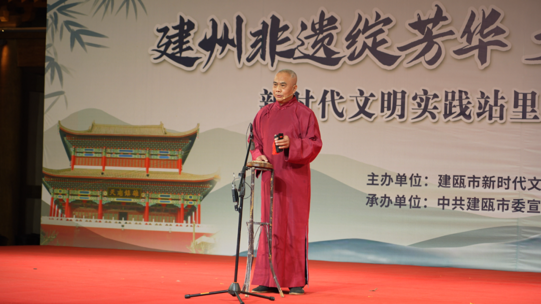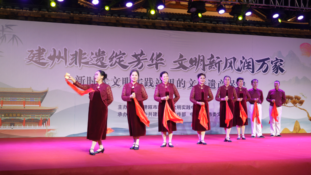 活动中,一系列精彩节目轮番上演。伞技表演《红红火火》以灵活巧妙的动作展现非遗魅力;童声表演《一起逛逛铁井栏》唤起市民对老街巷的集体记忆;古艺新传《风雅茶事》融合点茶、拓印、古琴与插花等,呈现非遗里的闲适与雅致;唱曲子《杨明劝妻》、手鼓表演《建州,嗨起来》等节目更是将现场气氛推向高潮。与此同时,中间穿插的互动有奖答题环节,不仅增强了观众的参与感,也让非遗保护知识在轻松愉快的氛围中深入人心。