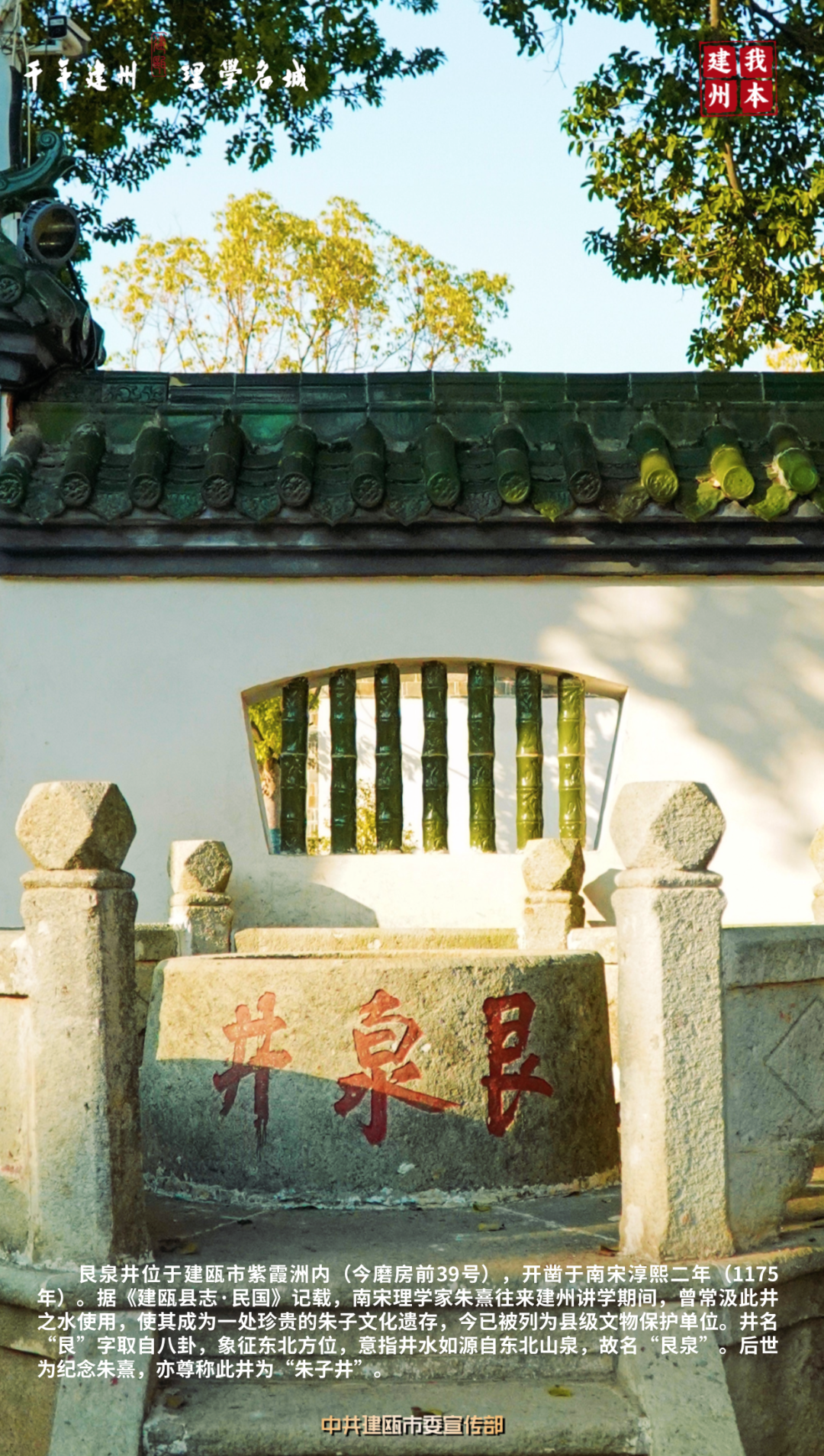 艮泉井位于建瓯市紫霞洲内(今磨房前39号),开凿于南宋淳熙二年(1175年)。据《建瓯县志·民国》记载,南宋理学家朱熹往来建州讲学期间,曾常汲此井之水使用,使其成为一处珍贵的朱子文化遗存,今已被列为县级文物保护单位。井名“艮”字取自八卦,象征东北方位,意指井水如源自东北山泉,故名“艮泉”。后世为纪念朱熹,亦尊称此井为“朱子井”。 |