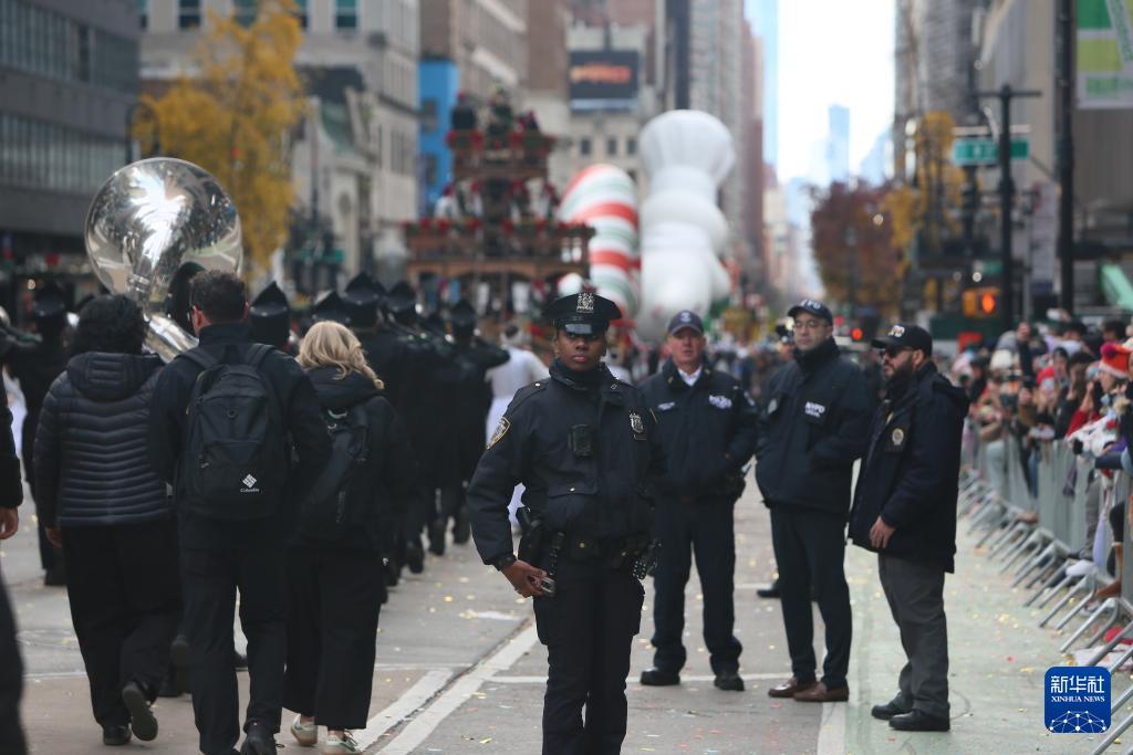 11月27日,在美国纽约,警察在感恩节游行活动现场值守。 由于近期美国发生多起安全事件,纽约在感恩节游行区域设置了数百个检查点和隔离区,部署了数千名警力并动用无人机,加强安全防范措施。 新华社记者 张凤国 摄