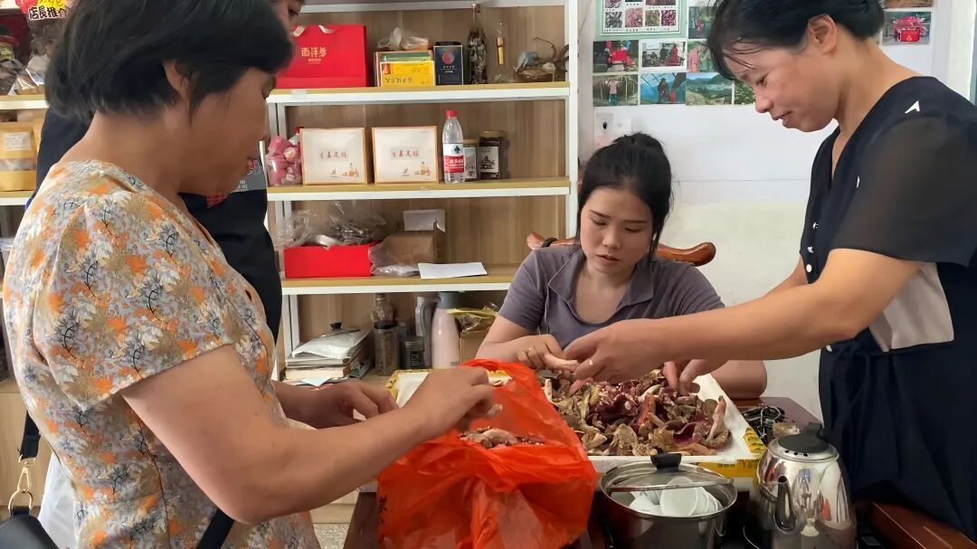 陈建珍向顾客介绍“农忙食间”卖的建瓯土特产 她还利用微商经验运营抖音、小红书,拍摄黄精采挖、古法工艺等短视频,一条黄精蒸制的视频点赞量达好几万。开通的“农忙食间”公众号,发布养生知识、工艺故事和风土人情,吸引了不少粉丝。 在泥土芬芳中领悟生活艺术 “阿珍,我今天采了一斤野生红菇,能卖多少钱?” “阿珍,我家的笋干晒好了,你要不要来看看?” 如今在迪口镇,越来越多村民主动找陈建珍卖农产品。这源于她推出的“农场+农户”模式。