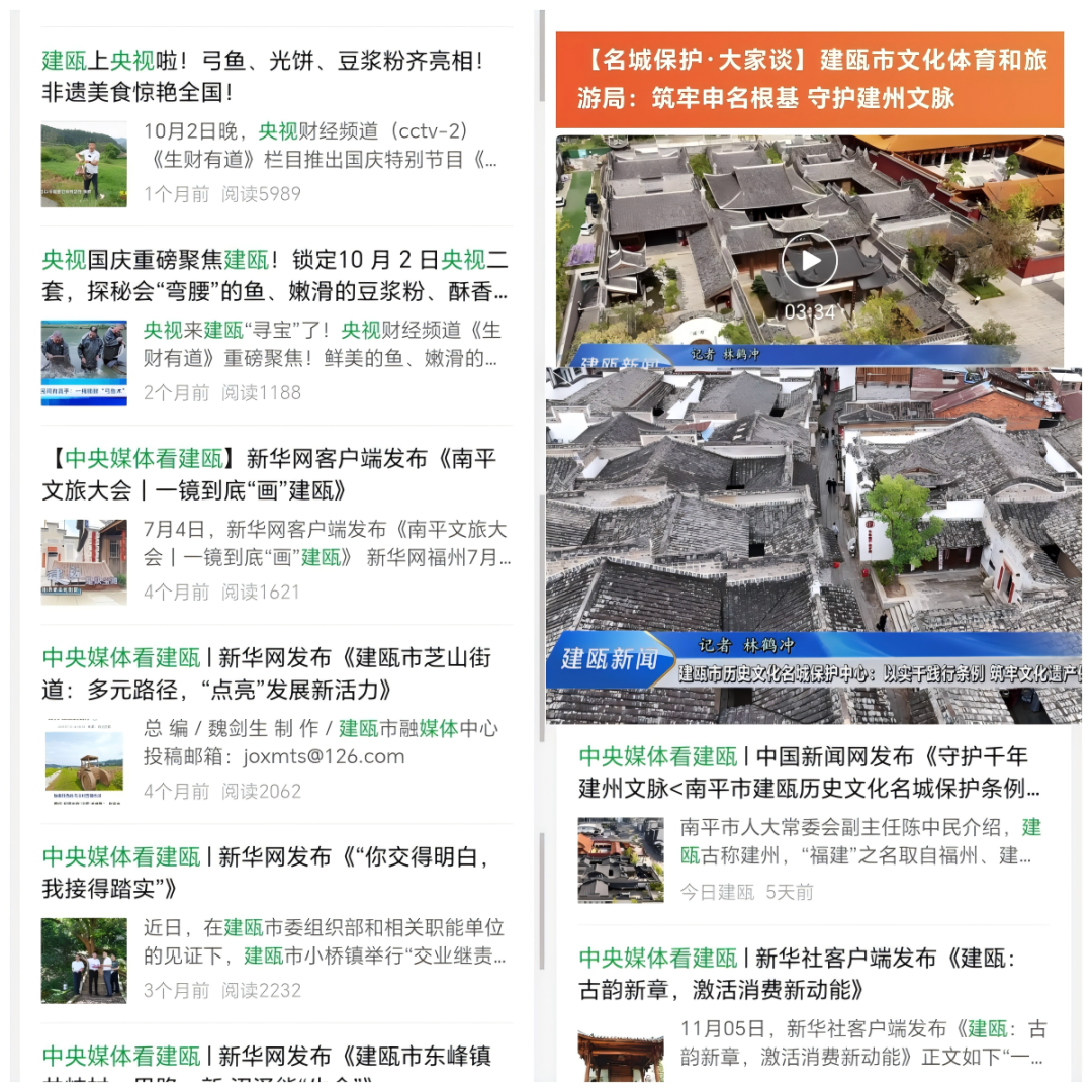 市委宣传部精心策划主题宣传,指导市融媒体中心在《建瓯新闻》、综合广播及“今日建瓯”微信公众号同步开设“申报国家历史文化名城”“千年建州 理学名城”等专栏,累计播出相关新闻节目200余条。举办“看见福建・千年建州”网络主题活动,设置“免费游建州”“建州网络星推官”等特色环节,集中展示建瓯历史街区、古建遗存与美食文化,活动全网传播量达1.3亿,#千年建州#等话题屡登热搜,吸引超7.2万网民互动,极大提升了建瓯历史文化名城的知名度与美誉度,带动文旅搜索量显著攀升。 同步开设“我本建州”文化主题公众号,设立“建州志”“建州韵”“建州游”等专栏,围绕朱子文化、茶文化、非遗与美食文化等“建”文化核心,推出《追访朱文公:朋友圈里的理学密码》《萌萌小黄鸭揭秘:建瓯板鸭的前世今生》等系列视频图文,并制作发布《千年建州·理学名城》城市形象宣传片,持续扩大“千年建州·理学名城”品牌影响力。 宣传声势持续扩大。对接新华社刊发《建瓯“创城”盼四项支持》获省委主要领导批示;新华社开设“以‘申名’推进建瓯高质量发展”专题;央视一套《三餐四季》、二套《生财有道》摄制组走进建瓯,集中展示美食、文化、旅游与产业发展亮点,全网曝光超9亿次。围绕“申名”宣传工作,在人民日报、新华社、光明日报、福建日报、福建电视台等中央及省级媒体刊发《以文兴城,打造文化传承新标杆》《建瓯:千年建州续风华 理学名城再出发》等相关报道300余篇(次),总浏览量突破1.5亿。其中,中央电视台《朝闻天下》播出的《多元拓展旅游体验 县域游成为新风尚》、《中国新闻》播出的《建瓯古城热闹喜庆贺新春》《各地小美好 汇成文旅大流量》等节目,引发社会各界对建瓯文旅的广泛关注。 “今年以来,我们共对接上级媒体76批185人次,持续从更深层次、更新视角做好‘申名’宣传。”市委宣传部新闻室科员范雨桐说。 网络宣传上,策划“何以中国・我本建州”短视频创意大赛,联合网络达人、旅游博主深入挖掘建州千年历史与非遗民俗,以年轻化表达激活文化内涵。开展“建瓯美食探秘直播”,组建“文化特派员助力团”,实地考察历史文化资源,推动“文化+网络大V”模式深度融合,助力历史遗存活化与文旅产业发展。 三、文艺浸润,展演名城时代风采