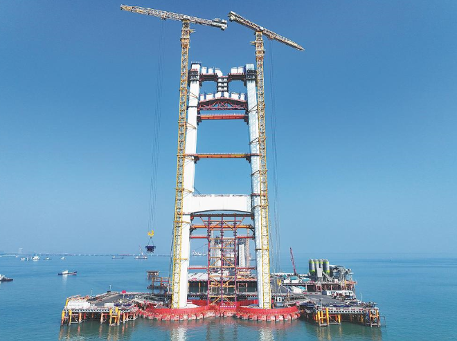 11日,厦金大桥刘五店航道桥东主塔横梁顺利合龙,标志着刘五店航道桥主塔工程全部完成。厦金大桥厦门段路线全长19.6公里,其中刘五店航道桥主跨928米、主塔高178.1米,是福建省内最大跨径桥梁,也是省内首座全离岸式海中悬索桥。大桥采用双塔双索面设计,两座主塔隔航道对称而立,以“門”字造型寓意“一桥连两门、两岸一家亲”。 林梓健 惠浩喆 摄 |