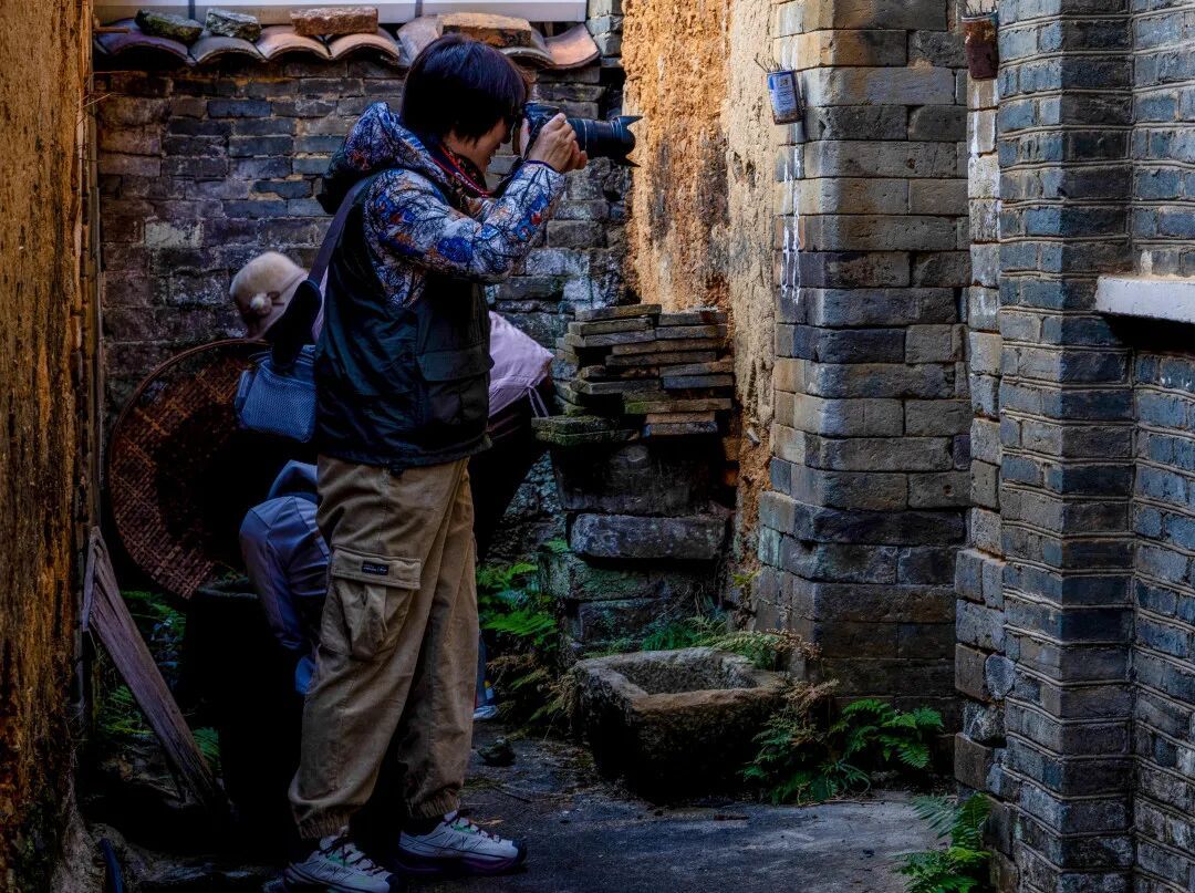 在摄影家的凝视下,古村的静物与人文交织成一幅幅生机盎然的画卷。青苔悄然爬上石阶,阳光穿过瓦隙,在斑驳墙面上投下摇曳叶影;幽深巷弄中,光线勾勒出雕花栏杆的精致与石门斗拱的沧桑。