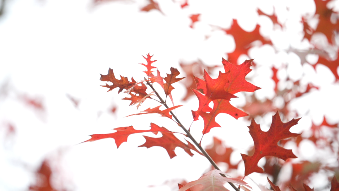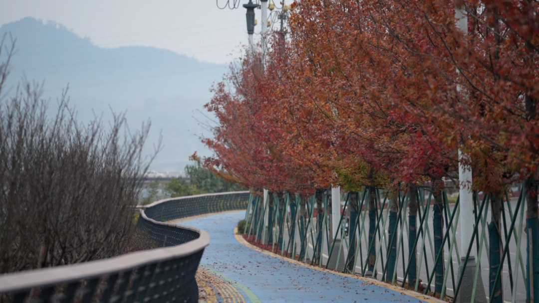 深秋时节,建州大道宛如一条浸染朱砂的绸带,蜿蜒伸展。步道两侧,猩红栎叶片红得炽烈,微风过处,红叶轻摇,沙沙作响。偶有叶片翩然飘落,为路面点缀上斑驳红意,一步一景,秋意正浓。