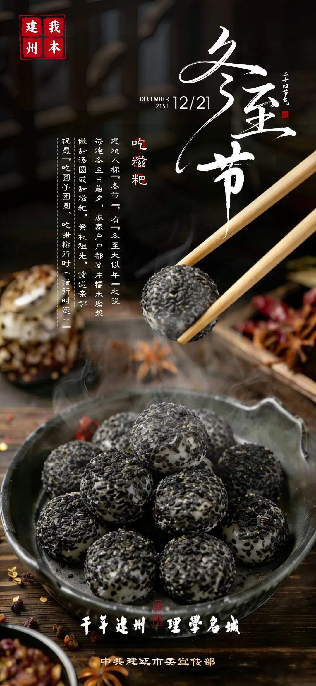 建瓯人称“冬节”,有“冬至大似年”之说。每逢冬至日前夕,家家户户都要用糯米磨浆,做甜汤圆或甜糍粑,祭祀祖先,馈送亲邻,祝愿“吃圆子团圆,吃甜糍行时(指行时运)” |
