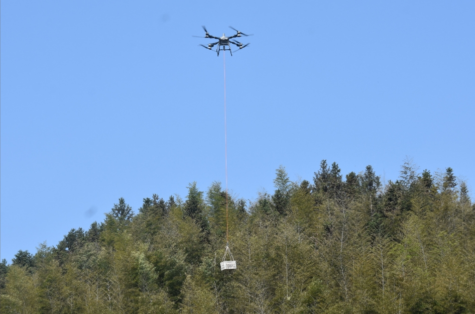 闽北多丘陵山地,茶树、果树等高杆作物密集,对无人机的稳定性、避障能力和喷洒精准度提出了极高要求。2020年春,针对武夷山星村镇茶农反映的“作业易碰撞茶丛、药液难渗透根部”问题,翁泽廉带领团队在茶山驻扎一个月,白天实测地形数据,晚上优化飞行算法,最终研发出山地茶园专用作业模式。这一创新不仅避免了作物碰撞,更使药液附着率提升40%,每亩作业成本降低25元,获得茶农广泛认可。 升级 抢抓低空经济风口破解运输难题 随着无人机喷洒技术普及,翁泽廉又将目光投向山区运输“老大难”问题。闽北山区“农资上山靠挑、农产品下山靠扛”,不仅效率低,更易造成鲜笋、茶青等生鲜农产品损耗。2024年,借着低空经济政策东风,他带领团队研发专用吊运无人机,让“空中运输队”替代了人工肩挑背扛。
