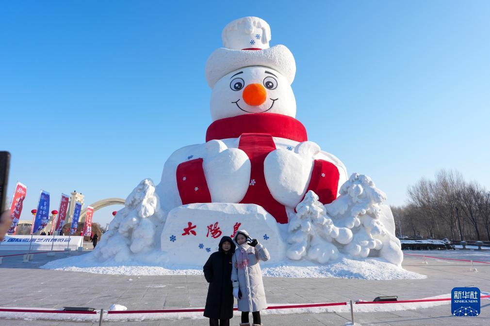 游客在第38届太阳岛国际雪雕艺术博览会园区大门前与大雪人景观合影(12月26日摄)。 12月27日,第38届太阳岛国际雪雕艺术博览会试开园。本届雪博会以“冰天雪地 诗情画意”为主题,规划面积达150万平方米,总用雪量12万立方米。从气势恢宏的大型雪雕群到精美逼真的创意雪雕作品,雪博会将为人们呈现一场冰城雪境的艺术盛宴。 新华社记者 王松 摄