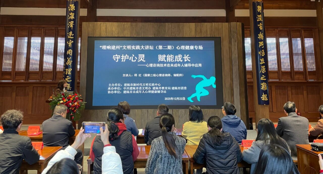 未成年人心理健康是全民健康的重要基石,更是城市文明进步与社会和谐发展的关键支撑。为深入贯彻落实新时代文明实践工作要求,提升基层心理辅导从业者专业素养,筑牢未成年人心理健康防护网,近日,“理响建州”文明实践大讲坛(第二期)心理健康专场活动在建安书院启幕。本次活动由建瓯市新时代文明实践中心主办,相关单位领导、业务负责人、辅导站志愿者及家长代表约60人齐聚一堂,共探未成年人心理成长赋能之道。