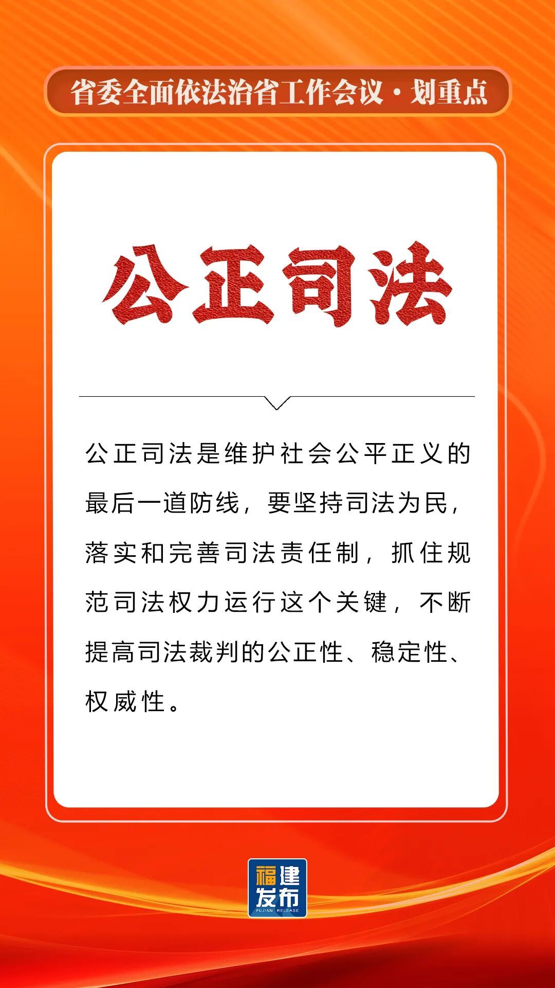 1月9日,省委全面依法治省工作会议在福州召开。 省委书记、省人大常委会主任,省委全面依法治省委员会主任周祖翼出席并讲话,强调“十五五”时期,要全面贯彻习近平法治思想,准确把握新时代新征程全面依法治省工作面临的新形势,牢牢把握法治工作的政治性、人民性、战略性、保障性,坚持法治福建、法治政府、法治社会一体建设,奋勇争先打造法治高地,为推进中国式现代化福建实践提供有力法治保障。 “十五五”时期全面依法治省 福建怎么干? 一组海报为您划重点↓