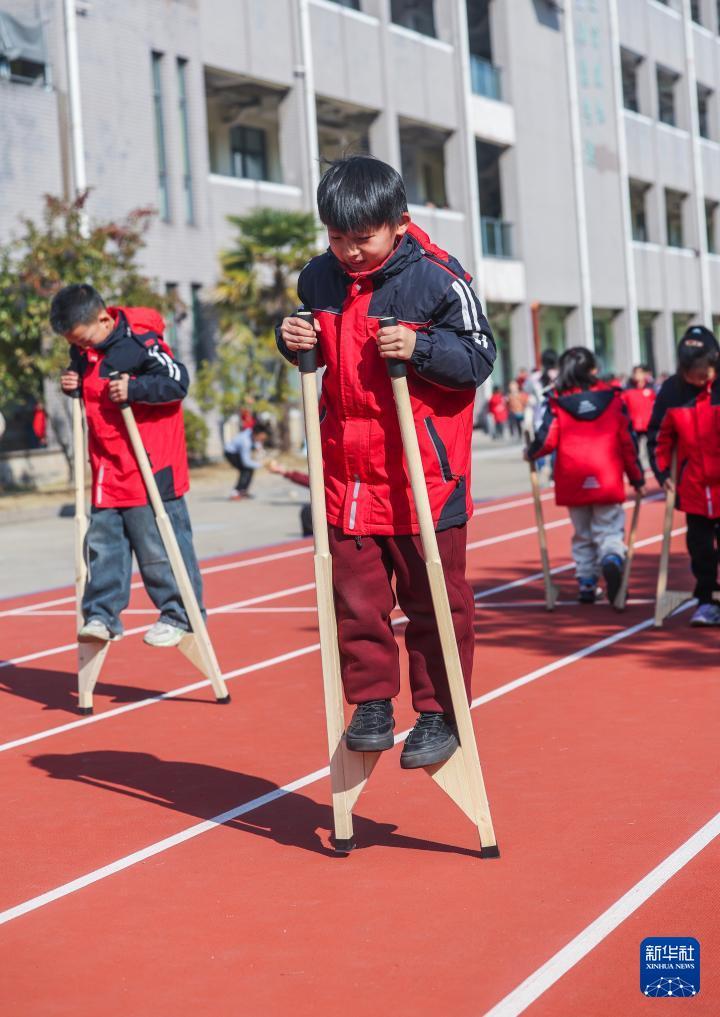 1月9日,诸暨市陶朱街道城西小学的学生在操场上踩高跷。 近期,为丰富学生课间生活、传承中华优秀传统文化,浙江省诸暨市陶朱街道中心学校下属各小学开设了传统游戏课程,打陀螺、跳房子、踩高跷等多项传统游戏让学生们玩得不亦乐乎。 新华社记者 徐昱 摄