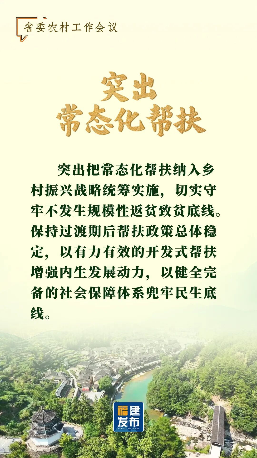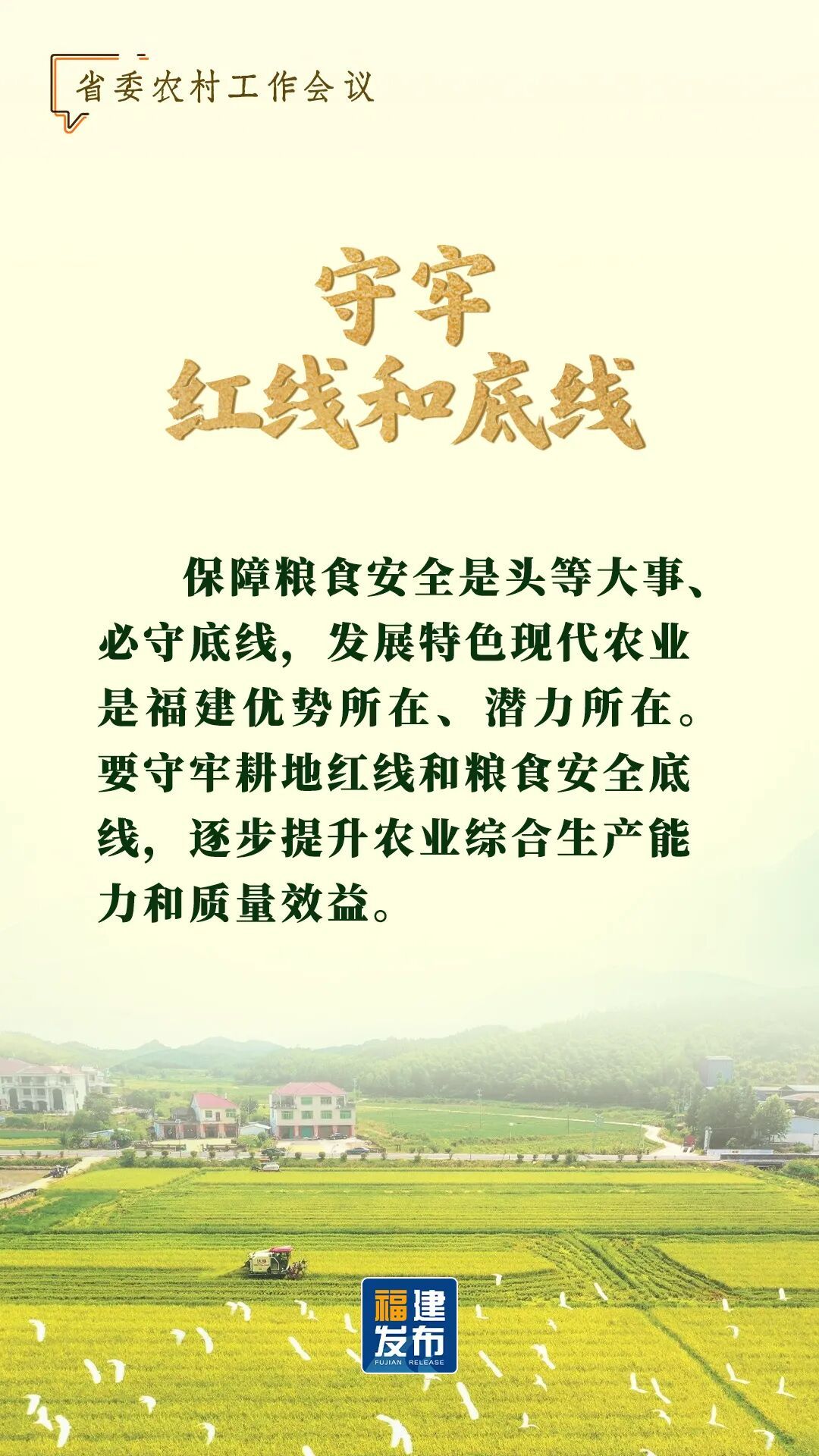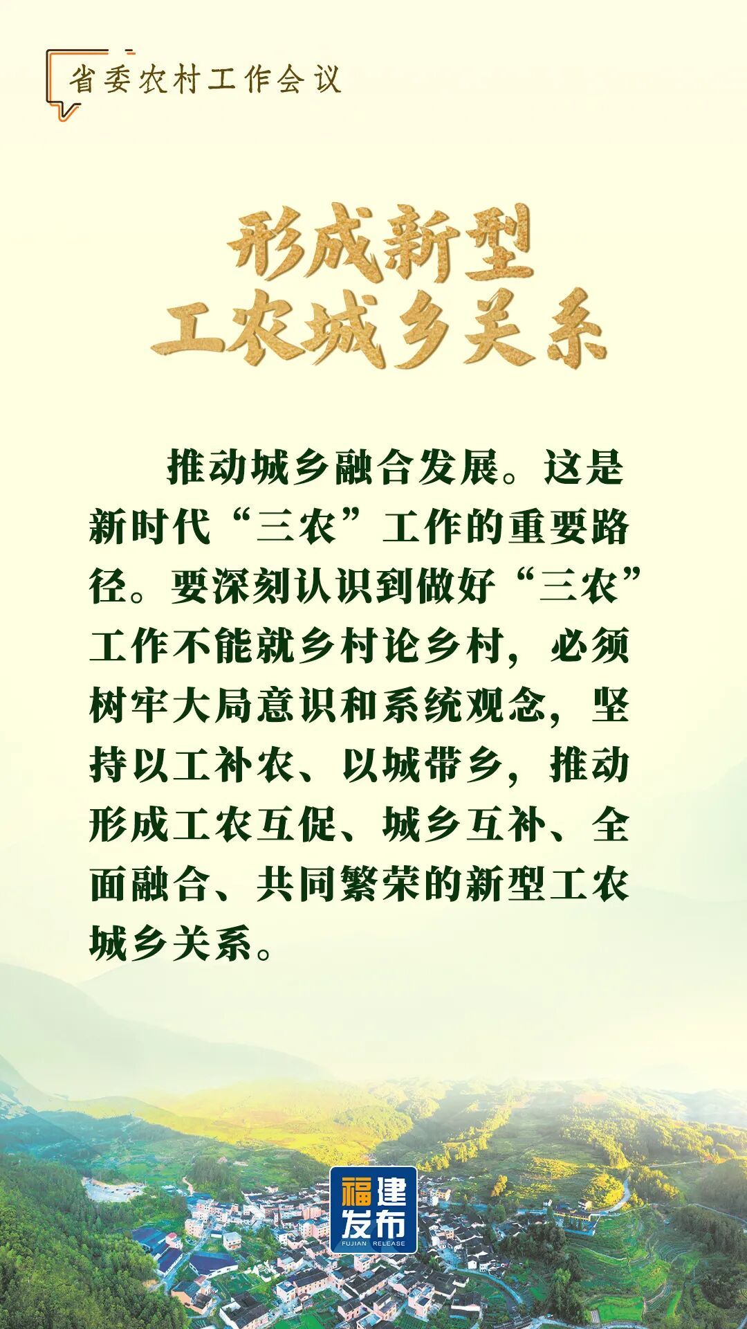 1月15日,省委农村工作会议在福州召开。 省委书记周祖翼出席并讲话,强调扎实做好“十五五”开局之年“三农”重点工作,要牢牢把握习近平总书记重要指示精神,按照中央农村工作会议部署,锚定农业农村现代化,扎实推进乡村全面振兴,推动城乡融合发展,努力把农业建成现代化大产业、使农村基本具备现代生活条件、让农民生活更加富裕美好。 让我们通过一组海报 速览会议要点 ↓↓↓