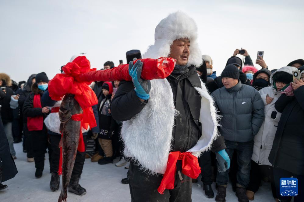 1月17日,在2026年兴凯湖冬捕节现场,渔民将渔网拽出冰面。 1月17日,2026兴凯湖冬捕节在中俄界湖兴凯湖畔启幕。人们在现场共同见证千米大网破冰而出,万鱼腾跃竞逐的震撼场景,感受传承千年的肃慎渔猎文化,体验北国边境冰雪文化独特魅力。 本届冬捕节以“文化+体育+旅游”融合发展为理念,精心打造全链条沉浸式体验矩阵,将“冷资源”转化为“热产业”。 新华社记者 张涛 摄