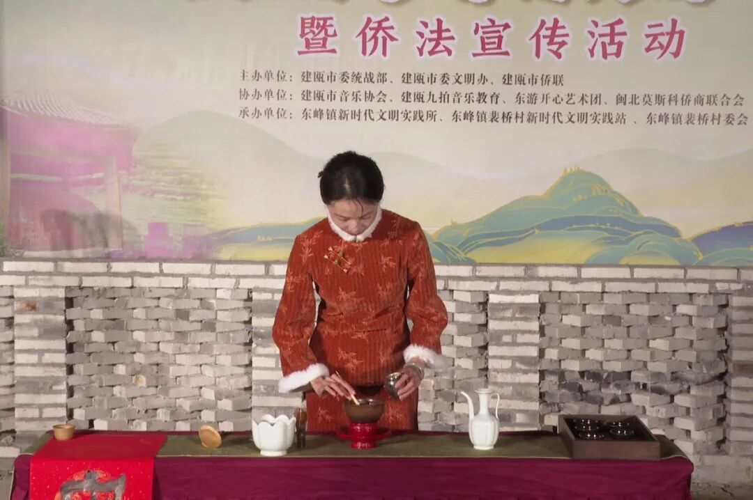 活动现场,灯火璀璨、热闹非凡。开场节目《我相信》节奏明快、充满力量,瞬间点燃现场气氛;歌舞《喀秋莎》独具异域风情,展现了侨界群体的多元文化风采;歌曲《晴天》《七里香》等经典旋律则引发了现场观众的共鸣;方言快板《劝酒经》,用接地气的乡音传递文明新风,诙谐幽默的表演让观众忍俊不禁;张莹莹带来的点茶技艺表演,则让现场群众领略了宋韵文化的独特韵味,她还分享了自己的 “新农人” 创业故事,传递出新时代青年投身乡村振兴的责任与担当,激励着更多人关注乡村、建设乡村。