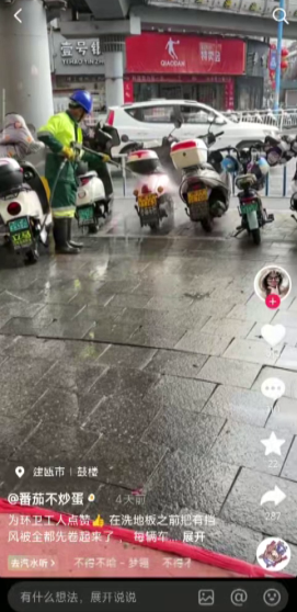 近日,一则记录我市环卫工人工作细节的短视频在社交平台引发关注。视频中,环卫工人在清洗街道前,主动将路边摩托车、电动车上的挡风逐一卷起,并细致冲洗每辆车的车身,这一暖心举动被路过的市民拍下并分享至网络,获得许多网友的评论与转发。