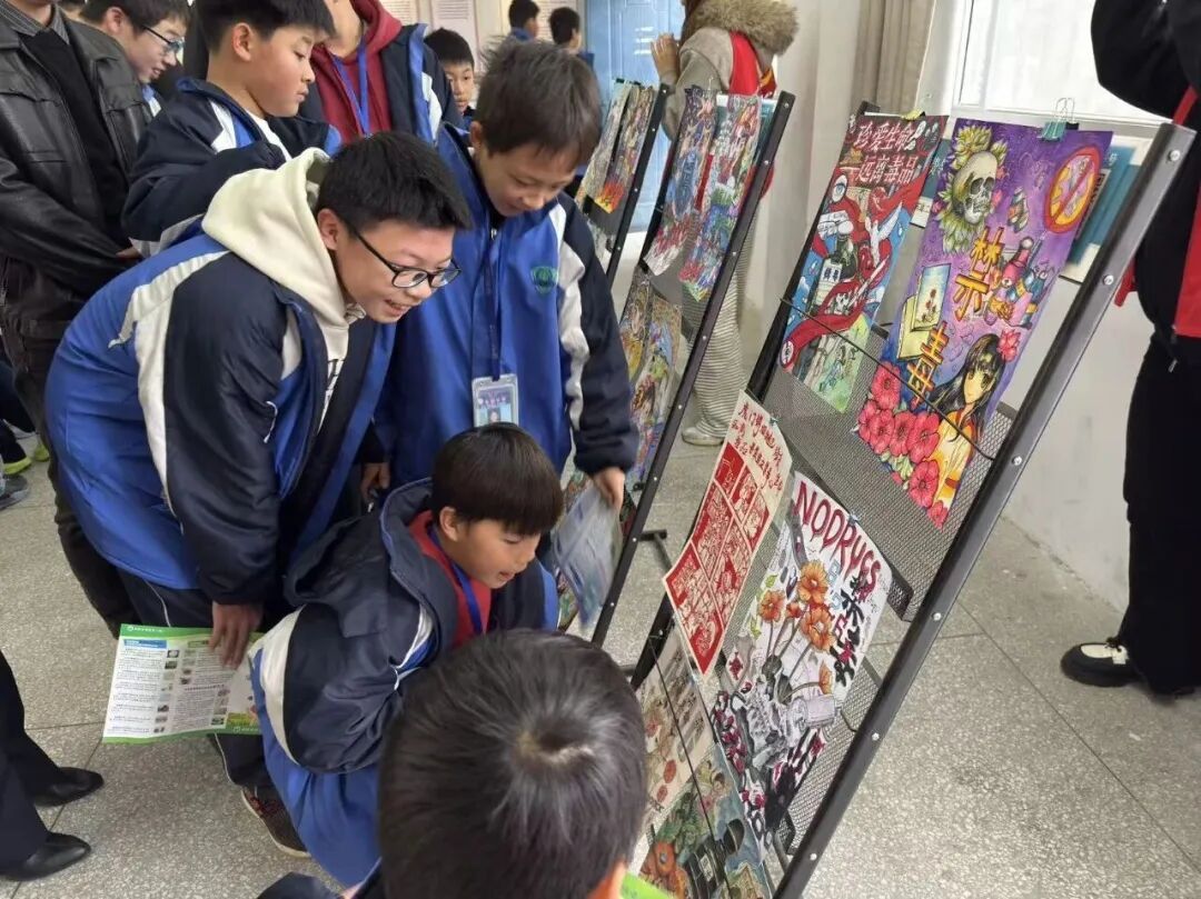 活动期间,工作人员向现场学生发放禁毒知识宣传单,引导大家对照内容梳理毒品危害与防范要点。同时,校内同步展出禁毒主题优秀绘画作品,学生有序参观,一幅幅以“阳光校园,绿色无毒”为主题的画作,让同学们加深对禁毒理念的理解,让禁毒宣传从入耳走向入心。