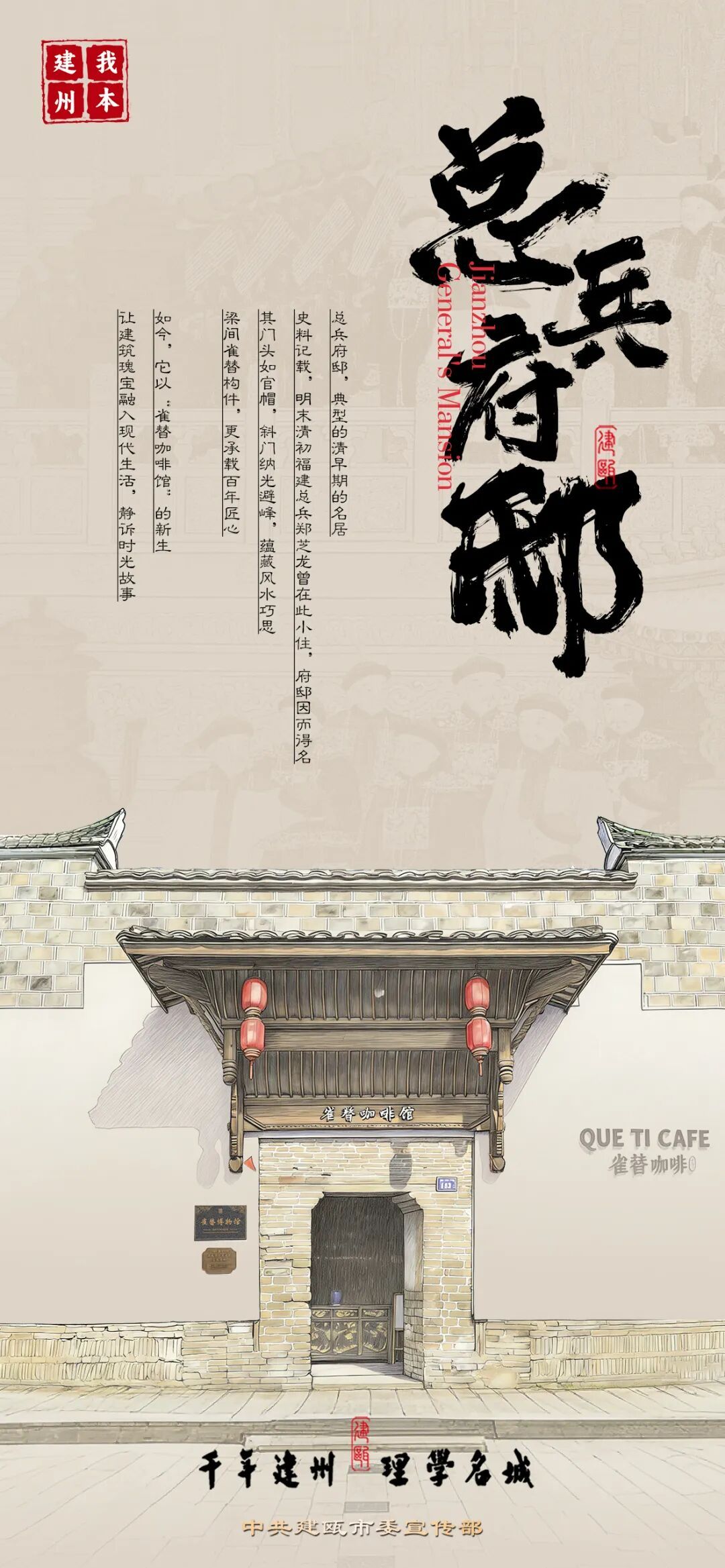 总兵府邸,典型的清早期的名居,史料记载,明末清初福建总兵郑芝龙曾在此小住,府邸因而得名。其门头如官帽,斜门纳光避峰,蕴藏风水巧思;梁间雀替构件,更承载百年匠心。如今,它以“雀替咖啡馆”的新生,让建筑瑰宝融入现代生活,静诉时光故事。 |