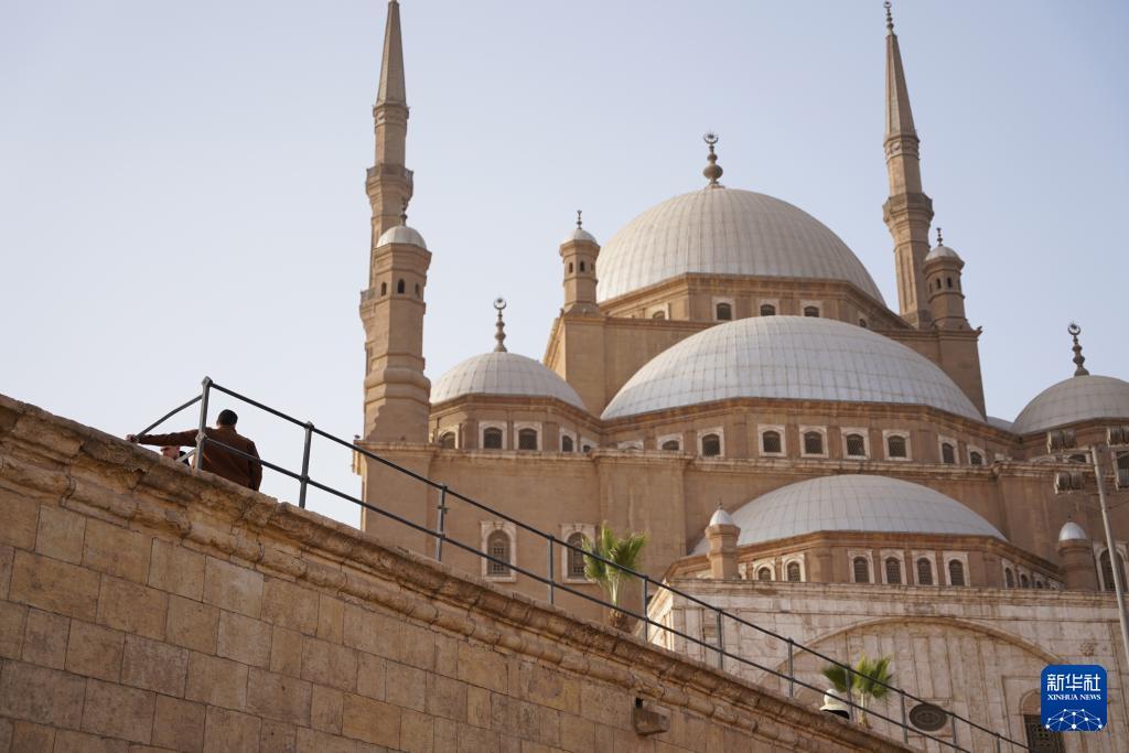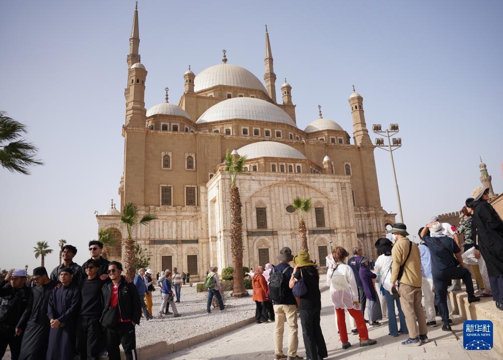 1月30日,游客在埃及开罗萨拉丁城堡内的穆罕默德·阿里清真寺前游览、合影。 萨拉丁城堡位于开罗东郊,由古代埃及苏丹萨拉丁为抗击十字军于公元12世纪建造,是开罗最著名古迹之一。 新华社记者 张浩波 摄