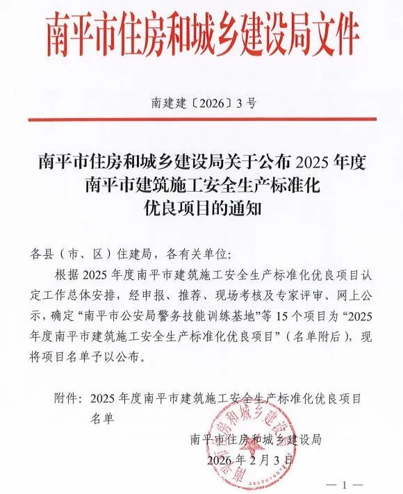 南平市建筑施工安全生产标准化优良项目由南平市住房和城乡建设局组织权威评定,是对项目管理体系、安全文明施工、风险防控及现场标准化水平的权威认证,代表着南平市建筑安全管理的标杆水平。 编辑 / 王俊杰 责编 / 巫雨蓉 主编 / 潘征翔 总编 / 魏剑生 |