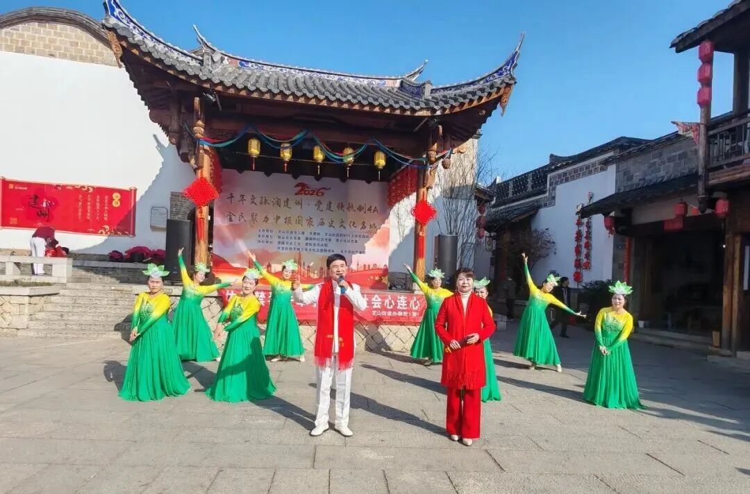 春潮涌动处,文脉续新篇。2月4日下午,一场以“千年文脉润建州 党建领航创4A”为主题的文艺演出在铁井栏古戏台圆满举行。本次活动由芝山街道党工委、办事处与街道新时代文明实践所联合主办,梨山社区党委、都御坪社区党委、青云社区党委共同承办。整场演出以群众喜闻乐见的艺术形式,将政策宣传、文明倡导与文化传承深度融合,为现场观众带来一场文化盛宴。