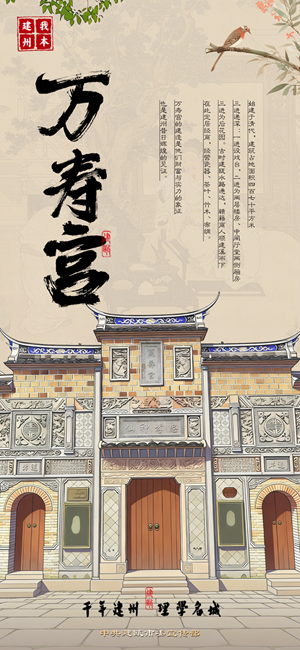 始建于清代,建筑占地面积四百七十平方米,三进递深:一进设戏台,二进为两层楼房、中间厅堂两侧厢房,三进为后花园。古时建瓯水路通达,赣籍商人顺建溪而下,在此定居经商,经营瓷器、茶叶、竹木、布绸。万寿宫的建造是他们财富与实力的象征,也是建州昔日辉煌的见证。 |