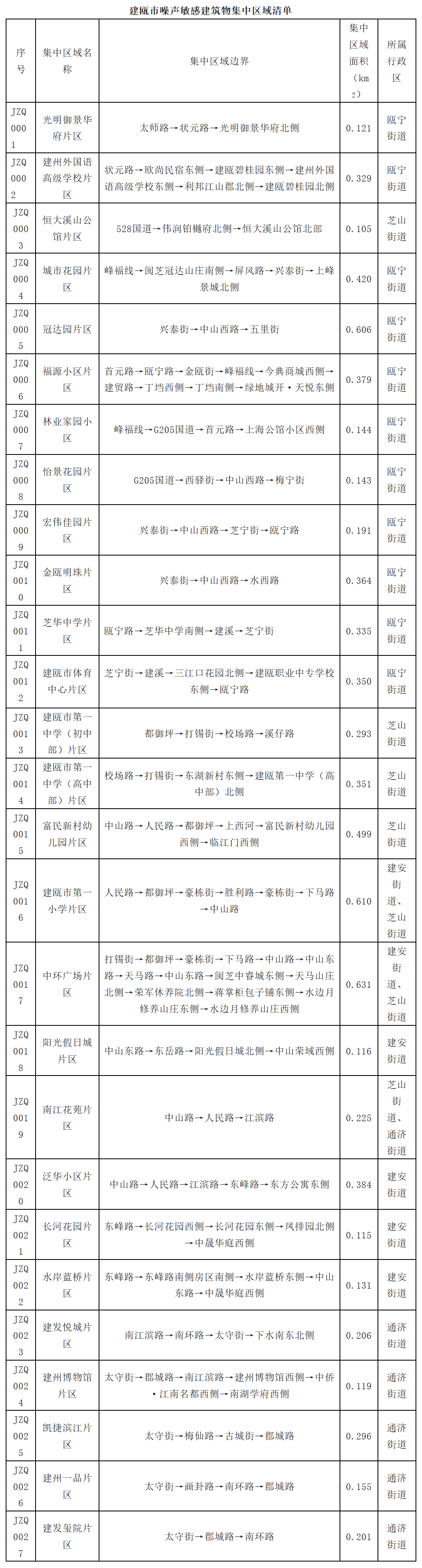 为贯彻落实《中华人民共和国噪声污染防治法》等要求,提高噪声污染防治措施的可操作性,改善城市声环境质量,进一步保障居民生活、学习和工作等场所的安静,依据《声环境质量标准》(GB3096-2008)、《声环境功能区划分技术规范》(GB/T15190-2014)等有关法律、标准和规范要求,现将建瓯市中心城区噪声敏感建筑物集中区域划定有关事项通告如下: 一、噪声敏感建筑物集中区域 本次共划定27个噪声敏感建筑物集中区域,集中区域编号为JZQ000X,集中区域声环境质量执行《建瓯市中心城区声环境功能区划》(瓯政办〔2022〕12号)要求。(区域信息详见附件1) 二、噪声敏感建筑物集中区域管理要求 根据《中华人民共和国噪声污染防治法》和《南平市人民政府办公室关于印发<中华人民共和国噪声污染防治法>部分条款部门职责分工方案的通知》(南政办〔2022〕32号),在噪声敏感建筑物集中区域内从事生产、生活或其他活动的,针对工业生产、建筑施工、交通运输和社会生活中所产生的环境噪声,应遵循以下要求: (一)工业噪声污染防治 1.工业企业选址应当符合国土空间规划以及相关规划要求,按照规划要求优化工业企业布局,防止工业噪声污染。在噪声敏感建筑物集中区域,禁止新建排放噪声的工业企业,改建、扩建工业企业的,应当采取有效措施防止工业噪声污染。 (二)建筑施工噪声污染防治 1.在噪声敏感建筑物集中区域施工作业,应当优先使用低噪声施工工艺和设备。 2.在噪声敏感建筑物集中区域施工作业,建设单位应当按照国家规定,设置噪声自动监测系统,与监督管理部门联网,保存原始监测记录,对监测数据的真实性和准确性负责。 3.禁止夜间进行产生噪声的建筑施工作业,但抢修、抢险施工作业,因生产工艺要求或者其他特殊需要必须连续施工作业的除外。因特殊需要必须连续施工作业的,应当取得住房和城乡建设、生态环境主管部门或者建瓯市人民政府指定部门的证明,并在施工现场显著位置公示或者以其他方式公告附近居民。 (三)交通运输噪声污染防治 1.新建公路、铁路线路选线设计,应当尽量避开噪声敏感建筑物集中区域。 2.新建、改建、扩建经过噪声敏感建筑物集中区域的高速公路、城市高架、铁路和城市轨道交通线路等的,建设单位应当在可能造成噪声污染的重点路段设置声屏障或者采取其他减少振动、降低噪声的措施,符合有关交通基础设施工程技术规范以及标准要求。 (四)社会生活噪声污染防治 禁止在噪声敏感建筑物集中区域使用高音广播喇叭,但紧急情况以及地方人民政府规定的特殊情形除外。在城市市区街道、广场、公园等公共场所组织娱乐、集会等活动,使用音响器材可能产生干扰周围生活环境的过大音量的,必须遵守当地公安机关的规定。 本通告自发布之日起施行,有效期5年。 附件:1.建瓯市噪声敏感建筑物集中区域清单 2.建瓯市噪声敏感建筑物集中区域分布图 建瓯市人民政府 2026年2月3日