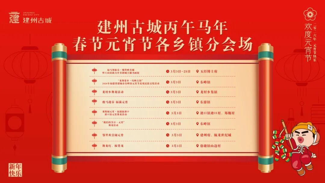 福灯高挂 · 平安祈愿 一盏福灯,一份心愿。 在古城挂上祈福灯笼, 写下平安、健康、顺遂、兴旺, 让灯火照亮新一年的美好期盼。 一村一俗,一街一景, 今年元宵,建瓯处处是热闹! 玉山镇 福马贺新春·翰墨映名城 暨玉山镇助力申名创城主题书画展 时间:3月3日-25日 地点:五经博士府 东峰镇 “龙舞茶乡・灯映古镇” 2026年福建省建瓯市东峰镇元宵节北苑民俗文化活动 时间:3月3日 地点:东峰镇 龙村乡 龙村乡舞龙活动 时间:3月3日 地点:集镇 东游镇 骏马迎春 福满元宵 时间:3月3日 地点:东游镇 迪口镇 龙腾闹元宵・福满新迪口 ——迪口镇元宵舞龙活动 时间:3月3日 地点:迪口镇迪口村、郑魏村 南雅镇 “我们的节日·元宵”舞龙活动 时间:3月3日 地点:南雅镇房村村 瓯宁街道 邻里欢喜闹元宵 (莲花社区) 时间:3月3日 地点:建州府、瓯龙世纪城 徐墩镇 舞龙灯、板凳龙 时间:3月3日 地点:徐墩镇山边村 预览表
