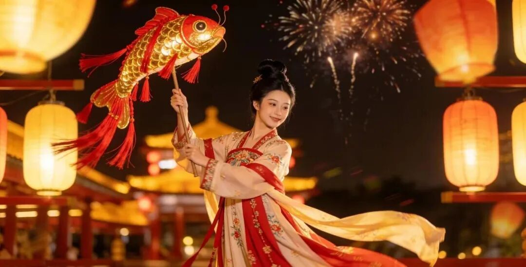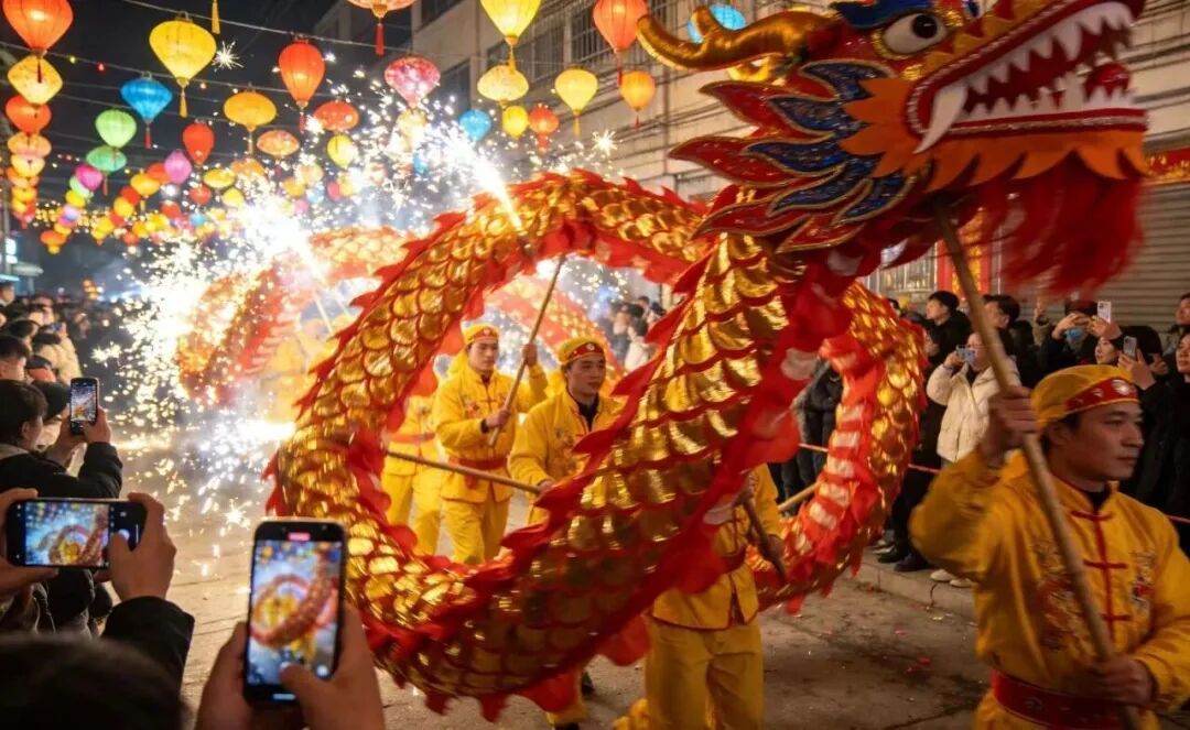 祥龙献瑞 · 华灯迎春 竹骨为身、彩纱覆鳞, 内置灯火,蜿蜒腾飞、流光溢彩, 九鱼采莲、五经魁灯阵, 锣鼓喧天、鞭炮齐鸣, 祈愿新岁风调雨顺、国泰民安。