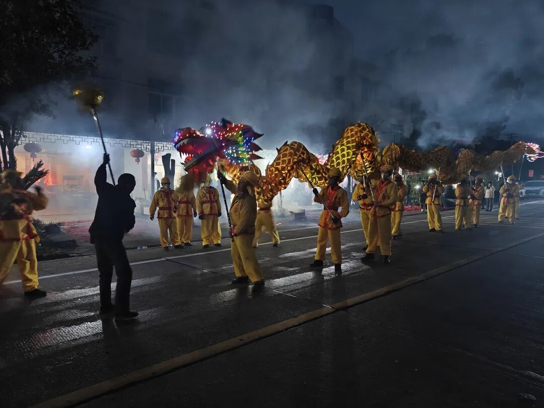 夜幕降临,舞龙表演更加精彩,伴随着铿锵有力的锣鼓声,一条金色巨龙在舞龙队员的手中蜿蜒盘旋、灵动飞舞。时而昂首腾飞,时而盘旋游走,每一个动作都气势磅礴,行云流水、整齐划一。龙珠引路,巨龙随行,金色的龙身在灯光映照下熠熠生辉,宛如穿梭在夜色中的星河,将元宵佳节的喜庆氛围瞬间拉满,引得围观群众阵阵喝彩,大家纷纷拿出手机记录下这喜庆瞬间,现场洋溢着欢乐祥和的节日氛围。