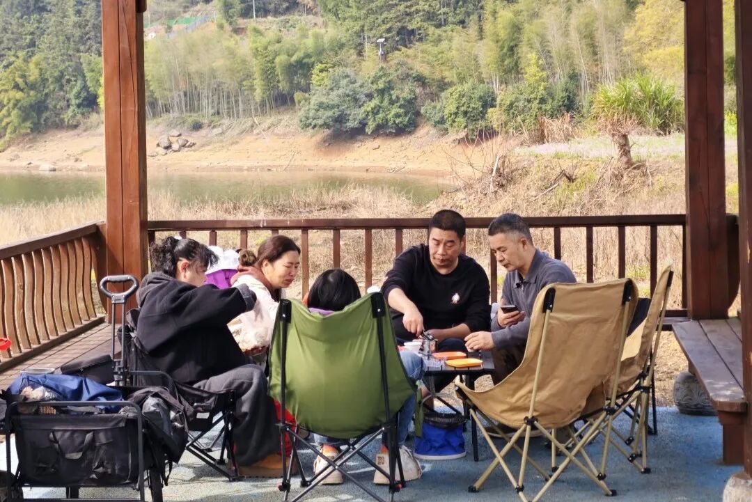 步入桃花岛,仿若置身画卷。山坡上、步道旁,粉黛桃花与金黄油菜花交相辉映,层层叠叠,铺展出一幅生机盎然的春日图景。游客三五成群,或驻足拍照,将笑靥与花影一同定格;或沿步道缓行,沉浸于山水相依的田园风光。休憩亭中,有人引吭高歌,以山野为舞台;水畔茶席旁,有人围炉煮茶,品一口春日的清欢。动静之间,尽显人与自然的和谐相融。