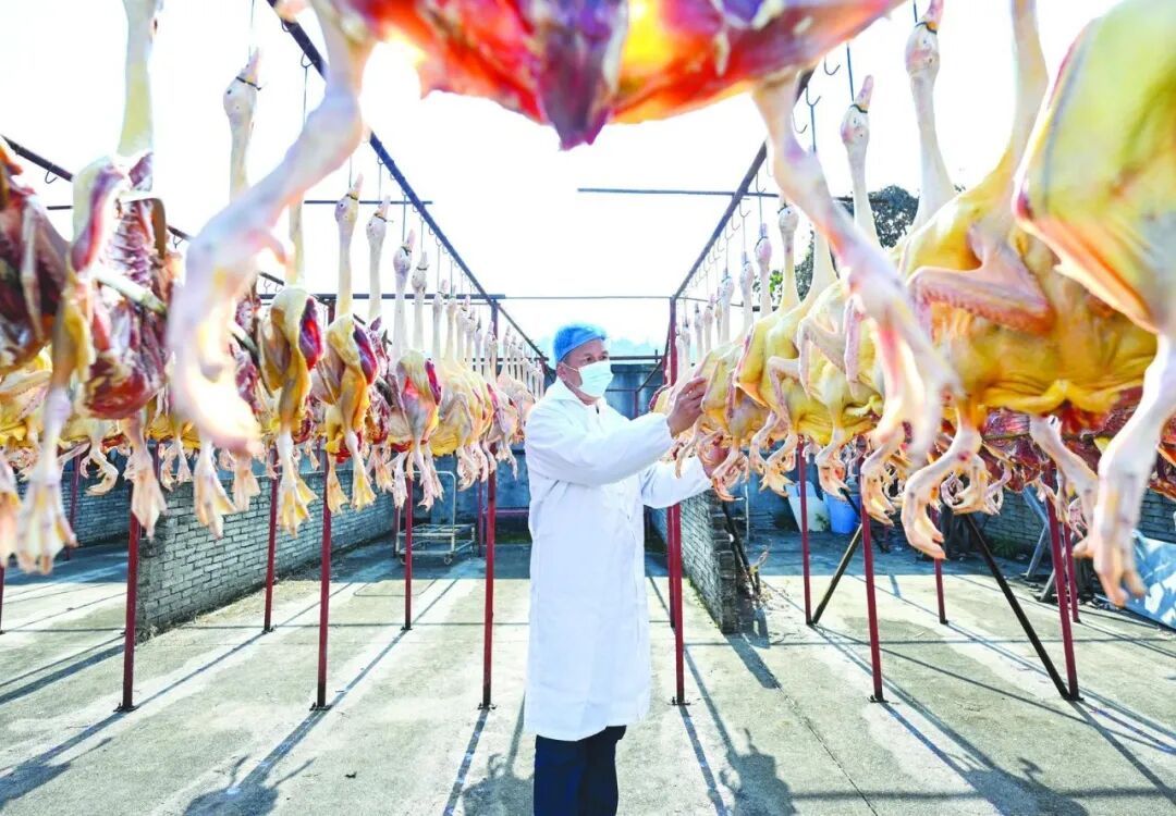这样的场景,在建瓯已经重复了近千年。 从村口晾晒的“土特产”到宫廷贡品、从口耳相传到标准化生产、从地方特产到城市名片……千年时光,浓缩于一只板鸭。它的故事,是建瓯人代代相传的乡愁技艺,是游子行囊里那沉甸甸的念想,更是一方水土在新时代续写的振兴篇章。 从民间至味到“汉席珍品” 如果美食也有履历,建瓯板鸭大概是闽北美食史中无法忽视的存在。 据史料记载,闽王王延政在后晋天福八年(943)称帝于建州(今建瓯),将本地板鸭正式列入御膳菜单,端上了宫廷餐桌。从此,板鸭不再是村口晒腊的“土味”,而是“可上庙堂”的珍馐。 到了南宋,孝宗赵昚(封建王时曾驻建安)对故乡风味念念不忘。登基后,他把建瓯板鸭带进临安皇宫,列为“汉席珍品”,让这道山乡小味成为宫廷宴席的常客。自此,板鸭的“高光时刻”被写进宋廷档案。 翻过古代宫廷御膳食谱,建瓯板鸭的故事也只讲了一半。 “许多人都会好奇,同样的制作手法,用于其他肉类家禽之上是否也能做出如此美味。”穿梭在成批风干的板鸭之中,建瓯板鸭同业公会会长叶国润讲起了一段口口相传的故事。 相传,建州曾有一位生活拮据的平民,他在寒冬时节饲养了十几只鹅。由于经济拮据,无法购买饲料继续喂养这些鹅,他只能逐只卖掉来筹集资金。 当卖到最后一只鹅的时候,他发现这样的做法杯水车薪。恰逢春节将至,家中无肉菜过年,又没有更多饲料喂养。他便决定杀掉最后的那只鹅,彼时条件匮乏,没有很好的保鲜措施。他的妻子便将鹅用盐腌制并晾晒,让它在寒冬腊月得以保存到除夕。 除夕夜,这道特别的菜肴被端上了餐桌,大家惊讶地发现,这只经过腌制的鹅干味道竟格外美味。“这板块鹅真好吃,我还要吃。”孩子们的称赞声让“板鹅”这个名字逐渐流传开来。自此以后,每到冬季准备年货时,当地人都会尝试制作“板鹅”。同样的方法也用在了鸡、鸭、肉鸽等禽类之上。 经过时间的检验,鸭子凭借其大小合适、肉质肥厚、咸香浓郁、肥而不腻的独特优势脱颖而出。“板鸭”的味道最受欢迎,逐渐发展成一种商品,并最终演变为如今的“建瓯板鸭”,在市场上占据一席之地,延续至今。 20世纪70年代,建瓯板鸭被中国食品总公司收入《家禽与传统禽制品》一书,与江苏南京板鸭、四川建昌板鸭、江西南安板鸭并称为“中国四大板鸭”。2018年,“建瓯板鸭”成功注册国家地理标志证明商标。 如今,为发展板鸭产业,建瓯市成立了板鸭同业公会,制定行业标准,将板鸭加工经营业主组成“联合舰队”闯市场。 近年,建瓯板鸭系列产品被授权使用“建字号”公用品牌,产品出口至俄罗斯、新加坡等国家和地区。 从掌心技艺到风土传承 清晨,来到建瓯市小松镇穆墩村的建瓯市润芝食品有限公司的板鸭生产车间,工人们将屠宰好的鸭子清洗干净,开始腌制上盐。 公司的板鸭晾晒场上,一排排晾晒架上,一只只板鸭排列得整整齐齐,像是走进一片板鸭“森林”。 “建瓯板鸭真正宗,土鸭吃粟一百工;剃前饿得腹里空,剃倒拔毛使滚汤;抹盐叠住腌一工,竹片撑开吹霜风;蒸得切片淋红酒,未曾开桌想动手;淋上麻油更有味,味道超过十香豉。”叶国润用建瓯话念了这首《板鸭谣》,短短几十个字把板鸭的传统技艺和食用方法说得一清二楚。 “这打油诗听着简单,内里可有大乾坤。”上手腌制的老师傅翁丁辉说。 原料要悉心挑选养殖期100—120天,不能下过蛋的番鸭。宰鸭的水温不能太高也不能太低,既要保证鸭皮不被烫伤,还要便于脱毛。叶国润补充说:“手法一定要快,鸭子浸在水里太久会变味。开膛破肚,去除内脏一定要去干净,否则不仅会影响风味,甚至可能会变质。”“别看我们这样随手一涂,这里头可大有讲究。”翁丁辉娓娓道来这里头的诀窍,“腌制鸭子,要上多少盐,与鸭子的大小、肉质厚薄,甚至气温、天气的阴晴都有关系。” 正因为这份需要感知的技艺,师傅在腌制时不能戴手套,需要用手感受鸭的情况。 腌制一天后,晾晒前还要用半干的布将腌制的鸭擦去水分,用小绳子穿过鸭的鼻子,再用竹片把鸭左右撑开呈板状,挂在透风处晾晒。通常,有霜的天气可以在太阳下稍微晾晒,一般三天就可以,再在无阳光直射且风大的地方晾干。 订单饱和的情况下,建瓯市润芝食品有限公司一天可以制作三四千只板鸭。即便面对如此大量的客户需求,润芝食品以及其他板鸭制作企业、家庭作坊,依旧坚持手工风干与自然晾晒,让“不油不腻”的核心风味得以保存,这也是建瓯板鸭广受青睐的重要原因。 “建瓯家家户户都会做板鸭。”翁丁辉说。正是因为建瓯这些板鸭制作企业、家庭作坊的存在,许多老手艺人通过制作板鸭,既能赚工钱,又可以将手艺传承下去。 经过多年的产业发展,板鸭在闽北其他县(市、区)也颇受欢迎,并发明了多种不同的新吃法,建瓯本土的蒸制、建阳的板鸭芥菜汤、浦城的板鸭火锅……建瓯板鸭在各地的“变形记”反过来丰富了板鸭的内涵,让它从一个地方特产,逐渐长成闽北共享的风味符号。 从一只板鸭到一条产业链 20世纪90年代,叶国润还在做肉兔养殖生意。一次偶然的机会,他接手了一批鸭子——卖不掉,也没处养。 他想起了母亲。老人家是做板鸭的一把好手,在建瓯,家家户户都会这门手艺。叶国润把鸭子交给母亲,请她全部制成板鸭,制成后由他带着成品去市场上试试水。 这