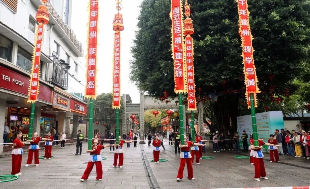 在三坊七巷主街,建瓯挑幡率先亮相,以刚劲有力的演绎彰显“千年建州”非遗风采。