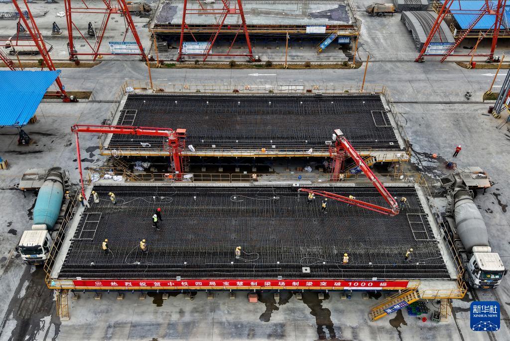 3月26日,工人在中铁四局宝慧制梁场1000榀箱梁浇筑施工现场进行混凝土浇筑作业。 3月26日,随着一榀长32.6米、重673吨的箱梁顺利完成浇筑,位于上海市宝山区的中铁四局沪宁合高铁沪宁段Ⅱ标宝慧制梁场预制箱梁产量成功突破1000榀大关,沪宁合高铁沪宁段及沪通铁路二期工程建设取得重要阶段性成果,为后续大规模架梁施工和全线贯通奠定了坚实基础。 沪宁合高铁沪宁段是国家“八纵八横”高速铁路网沿江高铁通道的重要组成部分,沪通铁路二期亦是沿海通道的关键一环。两条线路建成通车后,将在上海大都市圈、南京都市圈和合肥都市圈间建起一条快速新通道,对于优化沿长江地区铁路网布局、服务长江经济带协同发展、推动长三角高质量一体化发展具有重要意义。 新华社记者 方喆 摄