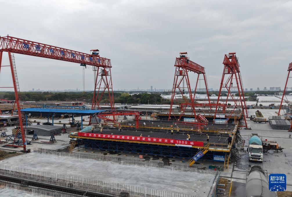3月26日,空中俯瞰中铁四局宝慧制梁场(无人机全景照片)。 3月26日,随着一榀长32.6米、重673吨的箱梁顺利完成浇筑,位于上海市宝山区的中铁四局沪宁合高铁沪宁段Ⅱ标宝慧制梁场预制箱梁产量成功突破1000榀大关,沪宁合高铁沪宁段及沪通铁路二期工程建设取得重要阶段性成果,为后续大规模架梁施工和全线贯通奠定了坚实基础。 沪宁合高铁沪宁段是国家“八纵八横”高速铁路网沿江高铁通道的重要组成部分,沪通铁路二期亦是沿海通道的关键一环。两条线路建成通车后,将在上海大都市圈、南京都市圈和合肥都市圈间建起一条快速新通道,对于优化沿长江地区铁路网布局、服务长江经济带协同发展、推动长三角高质量一体化发展具有重要意义。 新华社记者 方喆 摄