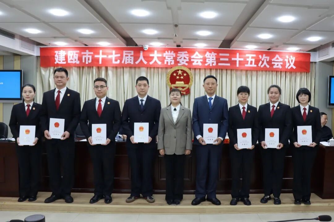 会议进行了有关人事任免事项,以按表决器表决方式通过了市监委、市法院有关人员免职的决定,以无记名投票表决方式通过了市监委、市法院人事事项。市人大常委会任命陈龙、廖靖两位同志为建瓯市监察委员会委员;新获任命的陈龙、廖靖两位同志分别在本次人大常委会会上作宪法宣誓。表决通过范晓璐、刘余、杨毅峰、杨式雯、陈晓玲、刘庆文六位同志的相关职务。
