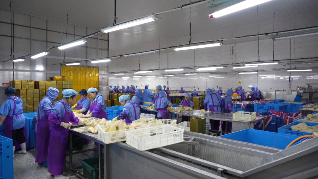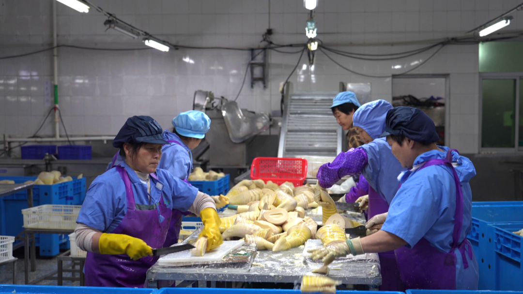 在建瓯绿剑食品有限公司的生产车间里,工人们正有序分拣、加工新鲜竹笋。据了解,当前企业每日消耗鲜笋量达八十万至九十万斤。