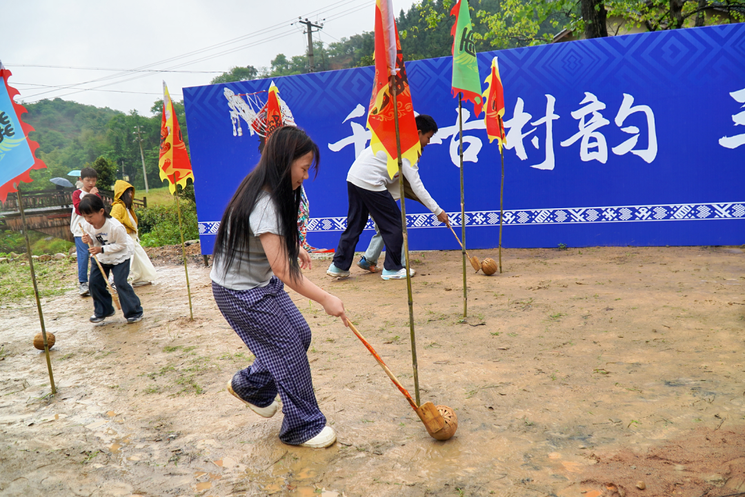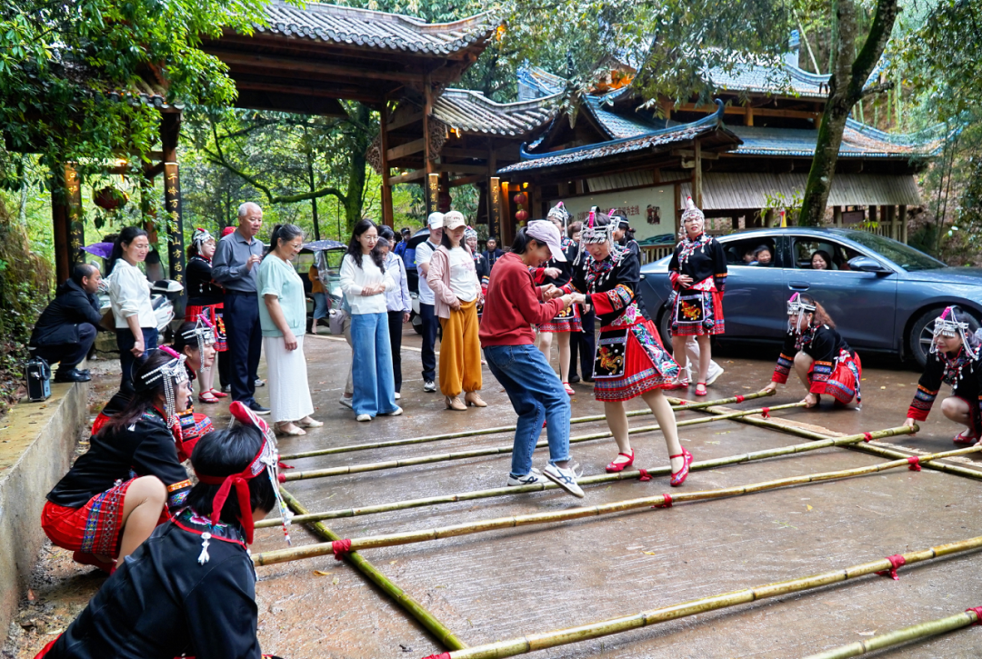 活动现场,民俗沉浸式体验成为最大亮点。畲族竹竿舞节奏明快、动感十足,村民和游客踏着竹竿开合的节拍灵动跳跃,赢得阵阵掌声;摇锅赛与赶野猪赛同样吸引了不少挑战者,游客与村民同台竞技,在协作比拼中感受畲族传统运动的独特魅力。舞台上,民族文艺汇演精彩纷呈,畲族服饰展示与文艺汇演轮番登场,浓郁的畲乡风情扑面而来。活动生动展现“各美其美、美美与共”的民族交融图景。